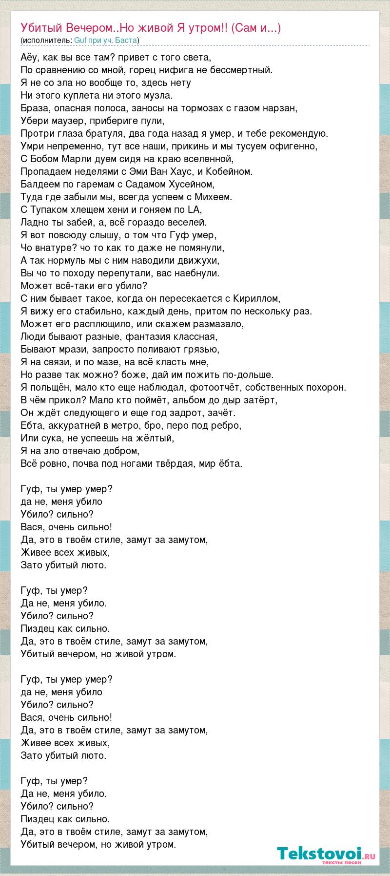 Аёу, как вы все там? привет с того света, По сравнению со мной, горец нифига не бессмертный. Я не со зла но вообще то, здесь нету Ни этого куплета ни этого музла. Браза, опасная полоса, заносы на тормозах с газом нарзан, Убери маузер, прибериге пули, Протри глаза братуля, два года назад я умер, и тебе рекомендую. Умри непременно, тут все наши, прикинь и мы тусуем офигенно, С Бобом Марли дуем сидя на краю вселенной, Пропадаем неделями с Эми Ван Хаус, и Кобейном. Балдеем по гаремам с Садамом Хусейном, Туда где забыли мы, всегда успеем с Михеем. С Тупаком хлещем хени и гоняем по LA, Ладно ты забей, а, всё гораздо веселей. Я вот повсюду слышу, о том что Гуф умер, Чо внатуре? чо то как то даже не помянули, А так нормуль мы с ним наводили движухи, Вы чо то походу перепутали, вас наебнули. Может всё-таки его убило? С ним бывает такое, когда он пересекается с Кириллом, Я вижу его стабильно, каждый день, притом по нескольку раз. Может его расплющило, или скажем размазало, Люди бывают разные, фантазия классная, Бывают мрази, запросто поливают грязью, Я на связи, и по мазе, на всё класть мне, Но разве так можно? боже, дай им пожить по-дольше. Я польщён, мало кто еще наблюдал, фотоотчёт, собственных похорон. В чём прикол? Мало кто поймёт, альбом до дыр затёрт, Он ждёт следующего и еще год задрот, зачёт. Ебта, аккуратней в метро, бро, перо под ребро, Или сука, не успеешь на жёлтый, Я на зло отвечаю добром, Всё ровно, почва под ногами твёрдая, мир ёбта. Гуф, ты умер умер? да не, меня убило Убило? сильно? Вася, очень сильно! Да, это в твоём стиле, замут за замутом, Живее всех живых, Зато убитый люто. Гуф, ты умер? Да не, меня убило. Убило? сильно? Пиздец как сильно. Да, это в твоём стиле, замут за замутом, Убитый вечером, но живой утром. Гуф, ты умер умер? да не, меня убило Убило? сильно? Вася, очень сильно! Да, это в твоём стиле, замут за замутом, Живее всех живых, Зато убитый люто. Гуф, ты умер? Да не, меня убило. Убило? сильно? Пиздец как сильно. Да, это в твоём стиле, замут за замутом, Убитый вечером, но живой утром.