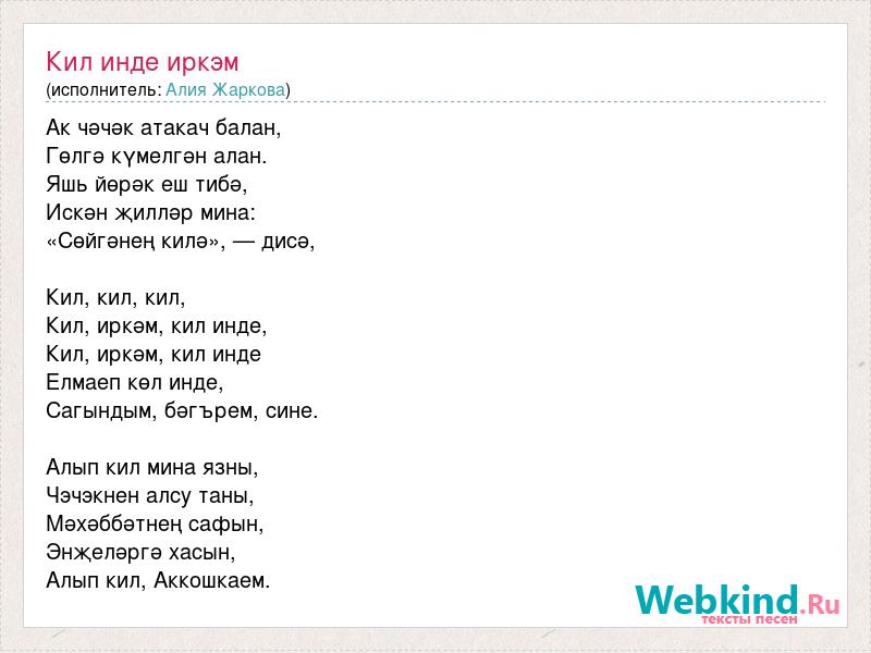 Ак чәчәк атакач балан, Гөлгә күмелгән алан. Яшь йөрәк еш тибә, Искән җилләр мина: «Сөйгәнең килә», — дисә, Кил, кил, кил, Кил, иркәм, кил инде, Кил, иркәм, кил инде Елмаеп көл инде, Сагындым, бәгърем, сине. Алып кил мина язны, Чэчэкнен алсу таны, Мәхәббәтнең сафын, Энҗеләргә хасын, Алып кил, Аккошкаем.