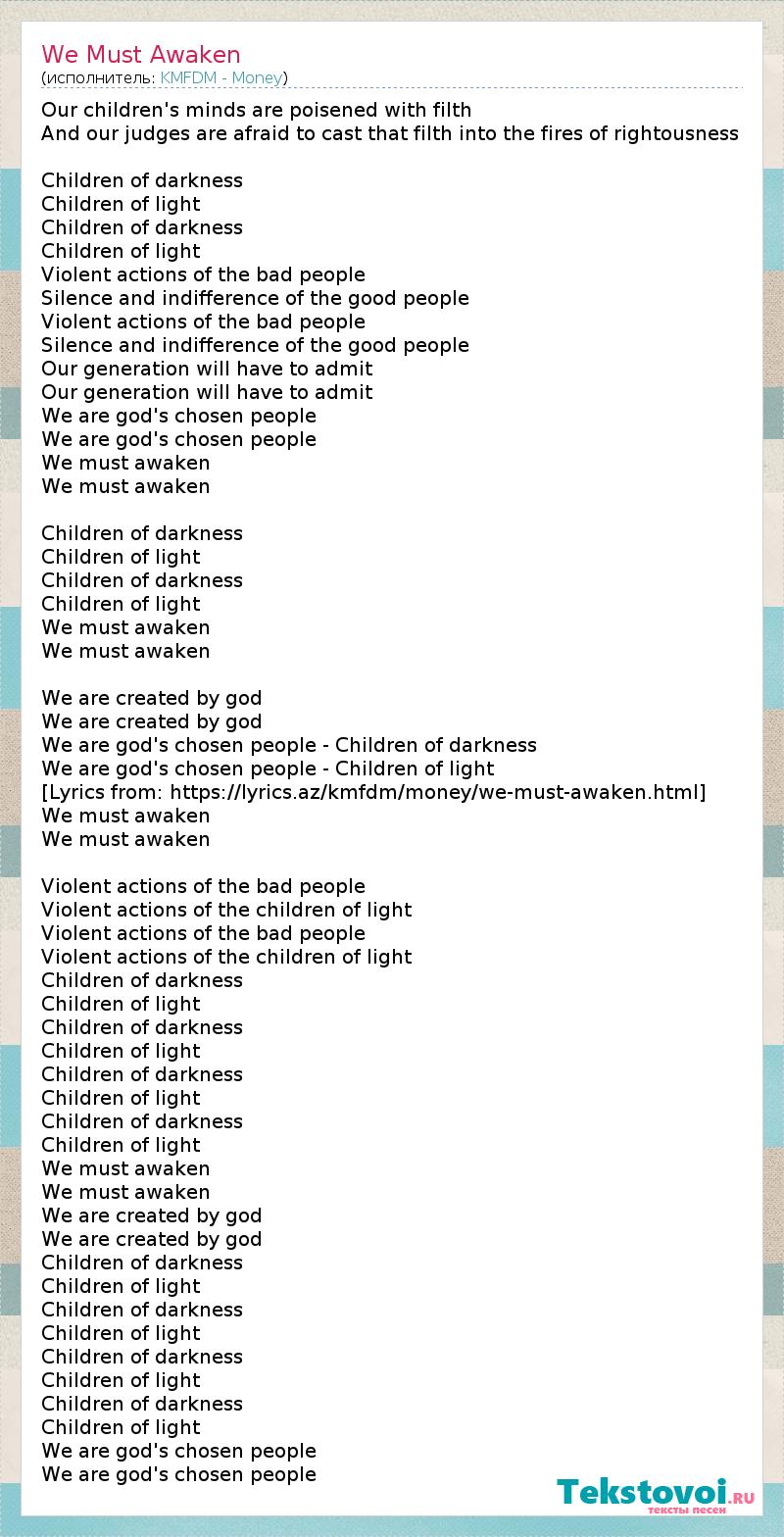 Our children's minds are poisened with filth And our judges are afraid to cast that filth into the fires of rightousness Children of darkness Children of light Children of darkness Children of light Violent actions of the bad people Silence and indifference of the good people Violent actions of the bad people Silence and indifference of the good people Our generation will have to admit Our generation will have to admit We are god's chosen people We are god's chosen people We must awaken We must awaken Children of darkness Children of light Children of darkness Children of light We must awaken We must awaken We are created by god We are created by god We are god's chosen people - Children of darkness We are god's chosen people - Children of light [Lyrics from: https://lyrics.az/kmfdm/money/we-must-awaken.html] We must awaken We must awaken Violent actions of the bad people Violent actions of the children of light Violent actions of the bad people Violent actions of the children of light Children of darkness Children of light Children of darkness Children of light Children of darkness Children of light Children of darkness Children of light We must awaken We must awaken We are created by god We are created by god Children of darkness Children of light Children of darkness Children of light Children of darkness Children of light Children of darkness Children of light We are god's chosen people We are god's chosen people