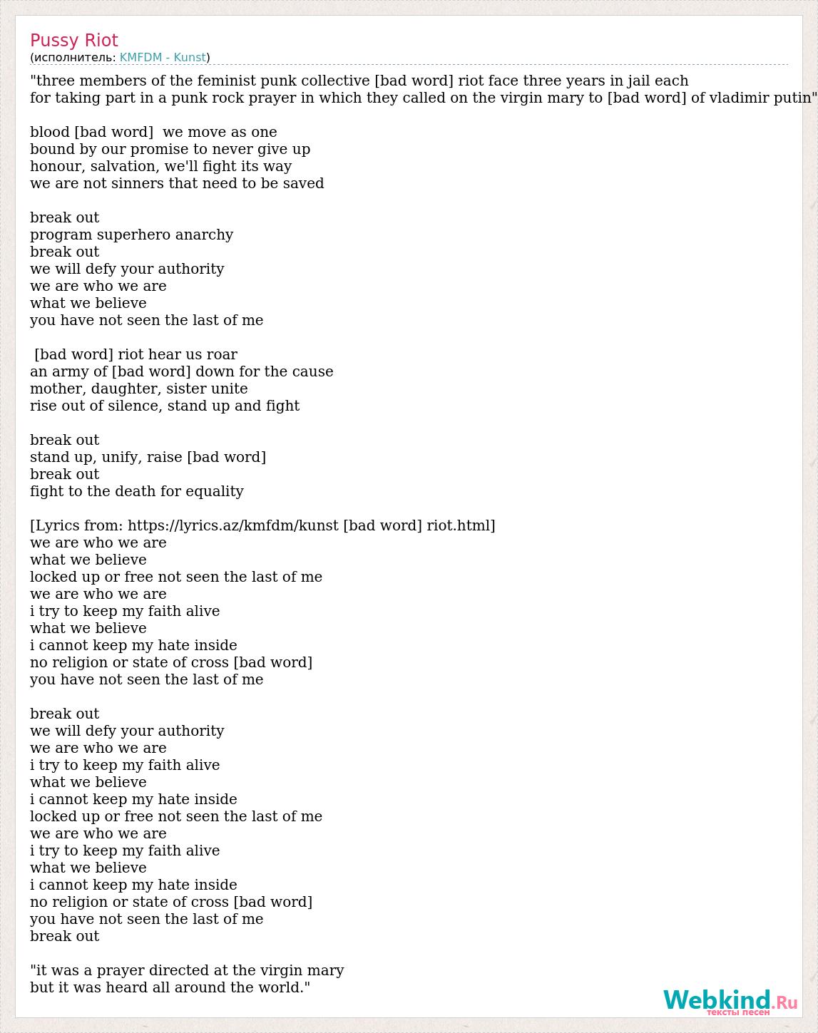 "three members of the feminist punk collective [bad word] riot face three years in jail each for taking part in a punk rock prayer in which they called on the virgin mary to [bad word] of vladimir putin" blood [bad word] we move as one bound by our promise to never give up honour, salvation, we'll fight its way we are not sinners that need to be saved break out program superhero anarchy break out we will defy your authority we are who we are what we believe you have not seen the last of me [bad word] riot hear us roar an army of [bad word] down for the cause mother, daughter, sister unite rise out of silence, stand up and fight break out stand up, unify, raise [bad word] break out fight to the death for equality [Lyrics from: https://lyrics.az/kmfdm/kunst [bad word] riot.html] we are who we are what we believe locked up or free not seen the last of me we are who we are i try to keep my faith alive what we believe i cannot keep my hate inside no religion or state of cross [bad word] you have not seen the last of me break out we will defy your authority we are who we are i try to keep my faith alive what we believe i cannot keep my hate inside locked up or free not seen the last of me we are who we are i try to keep my faith alive what we believe i cannot keep my hate inside no religion or state of cross [bad word] you have not seen the last of me break out "it was a prayer directed at the virgin mary but it was heard all around the world."