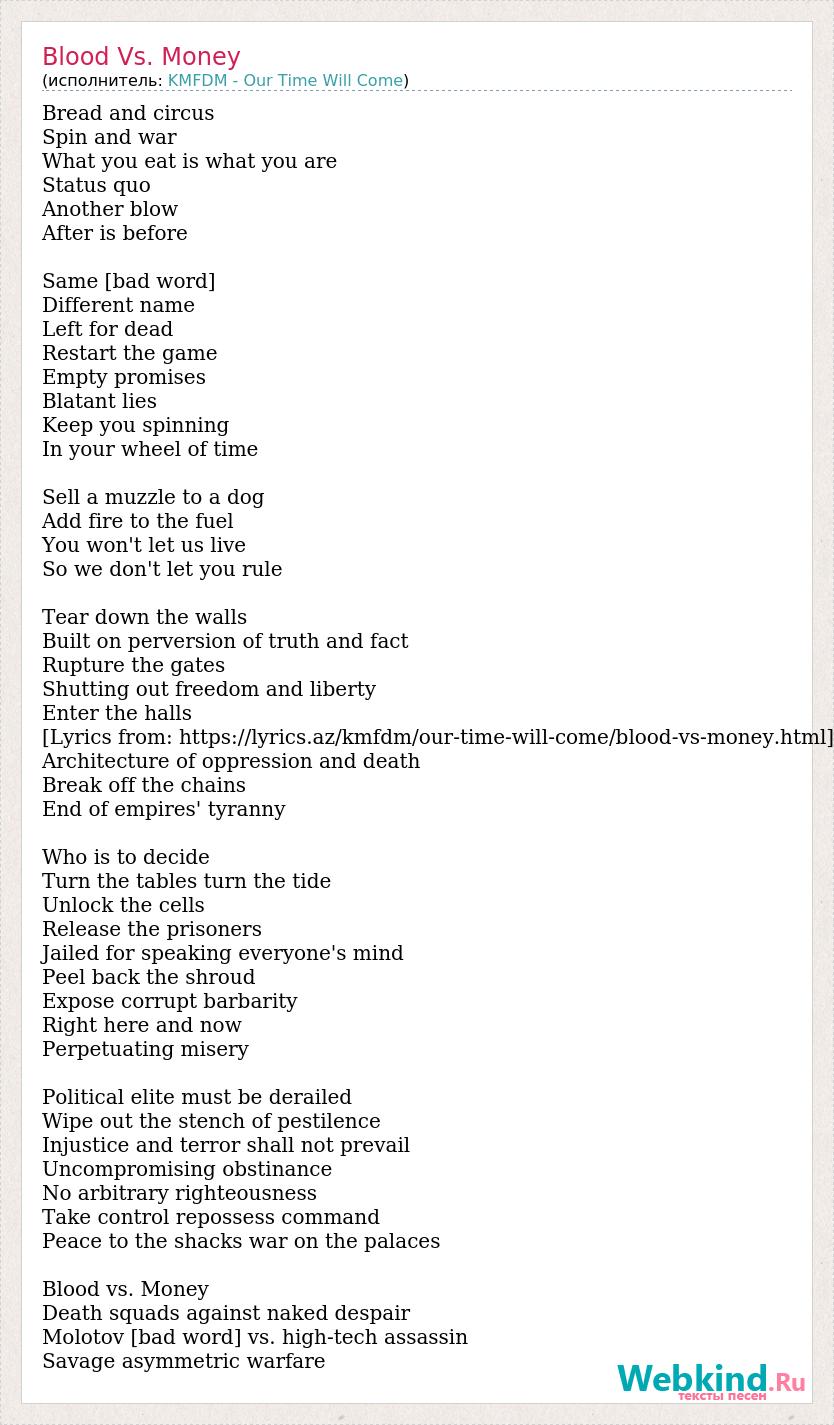 Bread and circus Spin and war What you eat is what you are Status quo Another blow After is before Same [bad word] Different name Left for dead Restart the game Empty promises Blatant lies Keep you spinning In your wheel of time Sell a muzzle to a dog Add fire to the fuel You won't let us live So we don't let you rule Tear down the walls Built on perversion of truth and fact Rupture the gates Shutting out freedom and liberty Enter the halls [Lyrics from: https://lyrics.az/kmfdm/our-time-will-come/blood-vs-money.html] Architecture of oppression and death Break off the chains End of empires' tyranny Who is to decide Turn the tables turn the tide Unlock the cells Release the prisoners Jailed for speaking everyone's mind Peel back the shroud Expose corrupt barbarity Right here and now Perpetuating misery Political elite must be derailed Wipe out the stench of pestilence Injustice and terror shall not prevail Uncompromising obstinance No arbitrary righteousness Take control repossess command Peace to the shacks war on the palaces Blood vs. Money Death squads against naked despair Molotov [bad word] vs. high-tech assassin Savage asymmetric warfare