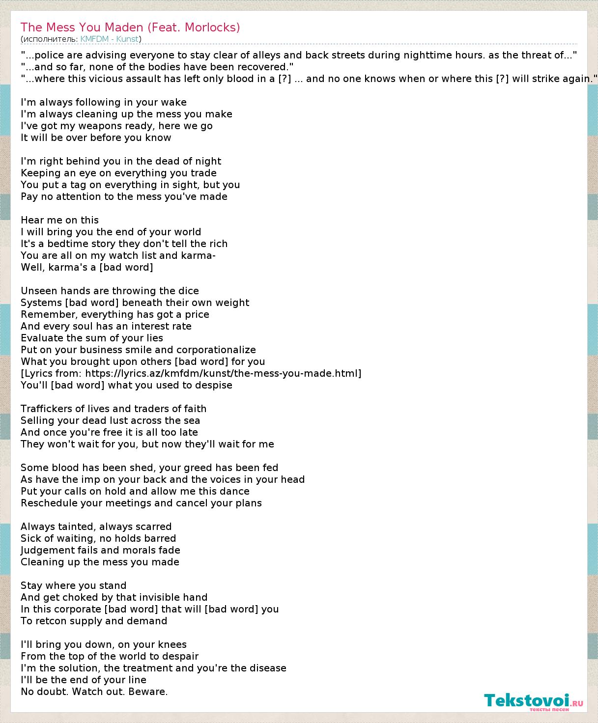 "...police are advising everyone to stay clear of alleys and back streets during nighttime hours. as the threat of..." "...and so far, none of the bodies have been recovered." "...where this vicious assault has left only blood in a [?] ... and no one knows when or where this [?] will strike again." I'm always following in your wake I'm always cleaning up the mess you make I've got my weapons ready, here we go It will be over before you know I'm right behind you in the dead of night Keeping an eye on everything you trade You put a tag on everything in sight, but you Pay no attention to the mess you've made Hear me on this I will bring you the end of your world It's a bedtime story they don't tell the rich You are all on my watch list and karma- Well, karma's a [bad word] Unseen hands are throwing the dice Systems [bad word] beneath their own weight Remember, everything has got a price And every soul has an interest rate Evaluate the sum of your lies Put on your business smile and corporationalize What you brought upon others [bad word] for you [Lyrics from: https://lyrics.az/kmfdm/kunst/the-mess-you-made.html] You'll [bad word] what you used to despise Traffickers of lives and traders of faith Selling your dead lust across the sea And once you're free it is all too late They won't wait for you, but now they'll wait for me Some blood has been shed, your greed has been fed As have the imp on your back and the voices in your head Put your calls on hold and allow me this dance Reschedule your meetings and cancel your plans Always tainted, always scarred Sick of waiting, no holds barred Judgement fails and morals fade Cleaning up the mess you made Stay where you stand And get choked by that invisible hand In this corporate [bad word] that will [bad word] you To retcon supply and demand I'll bring you down, on your knees From the top of the world to despair I'm the solution, the treatment and you're the disease I'll be the end of your line No doubt. Watch out. Beware.