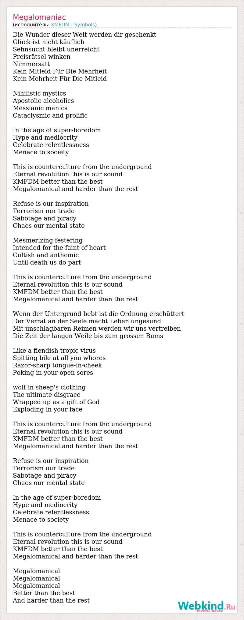 Die Wunder dieser Welt werden dir geschenkt Glück ist nicht käuflich Sehnsucht bleibt unerreicht Preisrätsel winken Nimmersatt Kein Mitleid Für Die Mehrheit Kein Mehrheit Für Die Mitleid Nihilistic mystics Apostolic alcoholics Messianic manics Cataclysmic and prolific In the age of super-boredom Hype and mediocrity Celebrate relentlessness Menace to society This is counterculture from the underground Eternal revolution this is our sound KMFDM better than the best Megalomanical and harder than the rest Refuse is our inspiration Terrorism our trade Sabotage and piracy Chaos our mental state Mesmerizing festering Intended for the faint of heart Cultish and anthemic Until death us do part This is counterculture from the underground Eternal revolution this is our sound KMFDM better than the best Megalomanical and harder than the rest Wenn der Untergrund bebt ist die Ordnung erschüttert Der Verrat an der Seele macht Leben ungesund Mit unschlagbaren Reimen werden wir uns vertreiben Die Zeit der langen Weile bis zum grossen Bums Like a fiendish tropic virus Spitting bile at all you whores Razor-sharp tongue-in-cheek Poking in your open sores wolf in sheep's clothing The ultimate disgrace Wrapped up as a gift of God Exploding in your face This is counterculture from the underground Eternal revolution this is our sound KMFDM better than the best Megalomanical and harder than the rest Refuse is our inspiration Terrorism our trade Sabotage and piracy Chaos our mental state In the age of super-boredom Hype and mediocrity Celebrate relentlessness Menace to society This is counterculture from the underground Eternal revolution this is our sound KMFDM better than the best Megalomanical and harder than the rest Megalomanical Megalomanical Megalomanical Better than the best And harder than the rest