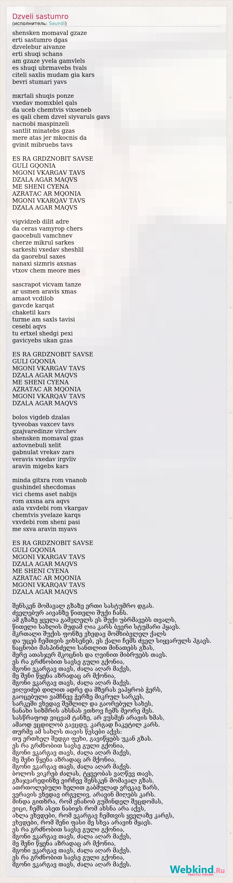 shensken momaval gzaze erti sastumro dgas dzvelebur aivanze erti shuqi schans am gzaze yvela gamvlels es shuqi ubrmavebs tvals citeli saxlis mudam gia kars bevri stumari yavs mкrtali shuqis ponze vxedav momxblel qals da uceb chemtvis vixseneb es qali chem dzvel siyvaruls gavs nacnobi maspinzeli santlit minatebs gzas mere atas jer mkocnis da gvinit mibruebs tavs ES RA GRDZNOBIT SAVSE GULI GQONIA MGONI VKARGAV TAVS DZALA AGAR MAQVS ME SHENI CYENA AZRATAC AR MQONIA MGONI VKARQAV TAVS DZALA AGAR MAQVS vigvidzeb dilit adre da ceras vamyrop chers gaocebuli vamchnev cherze mikrul sarkes sarkeshi vxedav sheshlil da gaorebul saxes nanaxi sizmris axsnas vtxov chem meore mes sascrapot vicvam tanze ar usmen aravis xmas amaot vcdilob gavcde karqat chaketil kars turme am saxls tavisi cesebi aqvs tu ertxel shedgi pexi gavicyebs ukan gzas ES RA GRDZNOBIT SAVSE GULI GQONIA MGONI VKARGAV TAVS DZALA AGAR MAQVS ME SHENI CYENA AZRATAC AR MQONIA MGONI VKARQAV TAVS DZALA AGAR MAQVS bolos vigdeb dzalas tyveobas vaxcev tavs gzajvaredinze virchev shensken momaval gzas axtovnebuli xelit gabnulat vrekav zars veravis vxedav irgvliv aravin migebs kars minda gitxra rom vnanob gushindel shecdomas vici chems aset nabijs rom axsna ara aqvs axla vxvdebi rom vkargav chemtvis yvelaze karqs vxvdebi rom sheni pasi me sxva aravin myavs ES RA GRDZNOBIT SAVSE GULI GQONIA MGONI VKARGAV TAVS DZALA AGAR MAQVS ME SHENI CYENA AZRATAC AR MQONIA MGONI VKARQAV TAVS DZALA AGAR MAQVS შენსკენ მომავალ გზაზე ერთი სასტუმრო დგას. ძველებურ აივანზე წითელი შუქი ჩანს. ამ გზაზე ყველა გამვლელს ეს შუქი უბრმავებს თვალს, წითელი სახლის მუდამ ღია კარს ბევრი სტუმარი ჰყავს. მკრთალი შუქის ფონზე ვხედავ მომხიბვლელ ქალს და უცებ ჩემთვის ვიხსენებ, ეს ქალი ჩემს ძველ სიყვარულს ჰგავს. ნაცნობი მასპინძელი სანთლით მინათებს გზას, მერე ათასჯერ მკოცნის და ღვინით მიბრუებს თავს. ეს რა გრძნობით სავსე გული გქონია, მგონი ვკარგავ თავს, ძალა აღარ მაქვს, მე შენი წყენა აზრადაც არ მქონია, მგონი ვკარგავ თავს, ძალა აღარ მაქვს. ვიღვიძებ დილით ადრე და მზერას ვაპყრობ ჭერს, გაოცებული ვამჩნევ ჭერზე მიკრულ სარკეს, სარკეში ვხედავ შეშლილ და გაორებულ სახეს, ნანახი სიზმრის ახსნას ვთხოვ ჩემს მეორე მეს. სასწრაფოდ ვიცვამ ტანზე, არ ვუსმენ არავის ხმას, ამაოდ ვცდილობ გავცდე, კარგად ჩაკეტილ კარს. თურმე ამ სახლს თავის წესები აქვს: თუ ერთხელ შედგი ფეხი, გავიწყებს უკან გზას. ეს რა გრძნობით სავსე გული გქონია, მგონი ვკარგავ თავს, ძალა აღარ მაქვს, მე შენი წყენა აზრადაც არ მქონია, მგონი ვკარგავ თავს, ძალა აღარ მაქვს. ბოლოს ვიკრებ ძალას, ტყვეობას ვაღწევ თავს, გზაჯვარედინზე ვირჩევ შენსკენ მომავალ გზას, ათრთოლებული ხელით გაბმულად ვრეკავ ზარს, ვერავის ვხედავ ირგვლივ, არავინ მიღებს კარს. მინდა გითხრა, რომ ვნანობ გუშინდელ შეცდომას, ვიცი, ჩემს ასეთ ნაბიჯს რომ ახსნა არა აქვს, ახლა ვხვდები, რომ ვკარგავ ჩემთვის ყველაზე კარგს, ვხვდები, რომ შენი ფასი მე სხვა არავინ მყავს. ეს რა გრძნობით სავსე გული გქონია, მგონი ვკარგავ თავს, ძალა აღარ მაქვს, მე შენი წყენა აზრადაც არ მქონია, მგონი ვკარგავ თავს, ძალა აღარ მაქვს. ეს რა გრძნობით სავსე გული გქონია, მგონი ვკარგავ თავს, ძალა აღარ მაქვს.