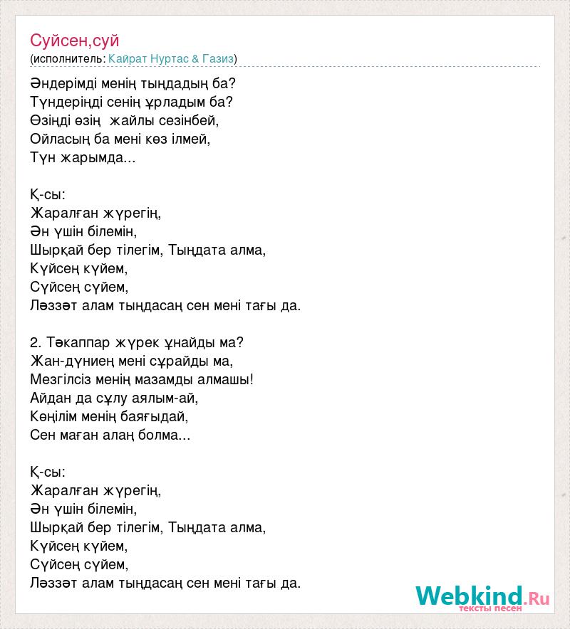 Əндерімді менің тыңдадың ба? Түндеріңді сенің ұрладым ба? Өзіңді өзің жайлы сезінбей, Ойласың ба мені көз ілмей, Түн жарымда... Қ-сы: Жаралған жүрегің, Əн үшін білемін, Шырқай бер тілегім, Тыңдата алма, Күйсең күйем, Сүйсең сүйем, Лəззəт алам тыңдасаң сен мені тағы да. 2. Тəкаппар жүрек ұнайды ма? Жан-дүниең мені сұрайды ма, Мезгілсіз менің мазамды алмашы! Айдан да сұлу аялым-ай, Көңілім менің баяғыдай, Сен маған алаң болма... Қ-сы: Жаралған жүрегің, Əн үшін білемін, Шырқай бер тілегім, Тыңдата алма, Күйсең күйем, Сүйсең сүйем, Лəззəт алам тыңдасаң сен мені тағы да.