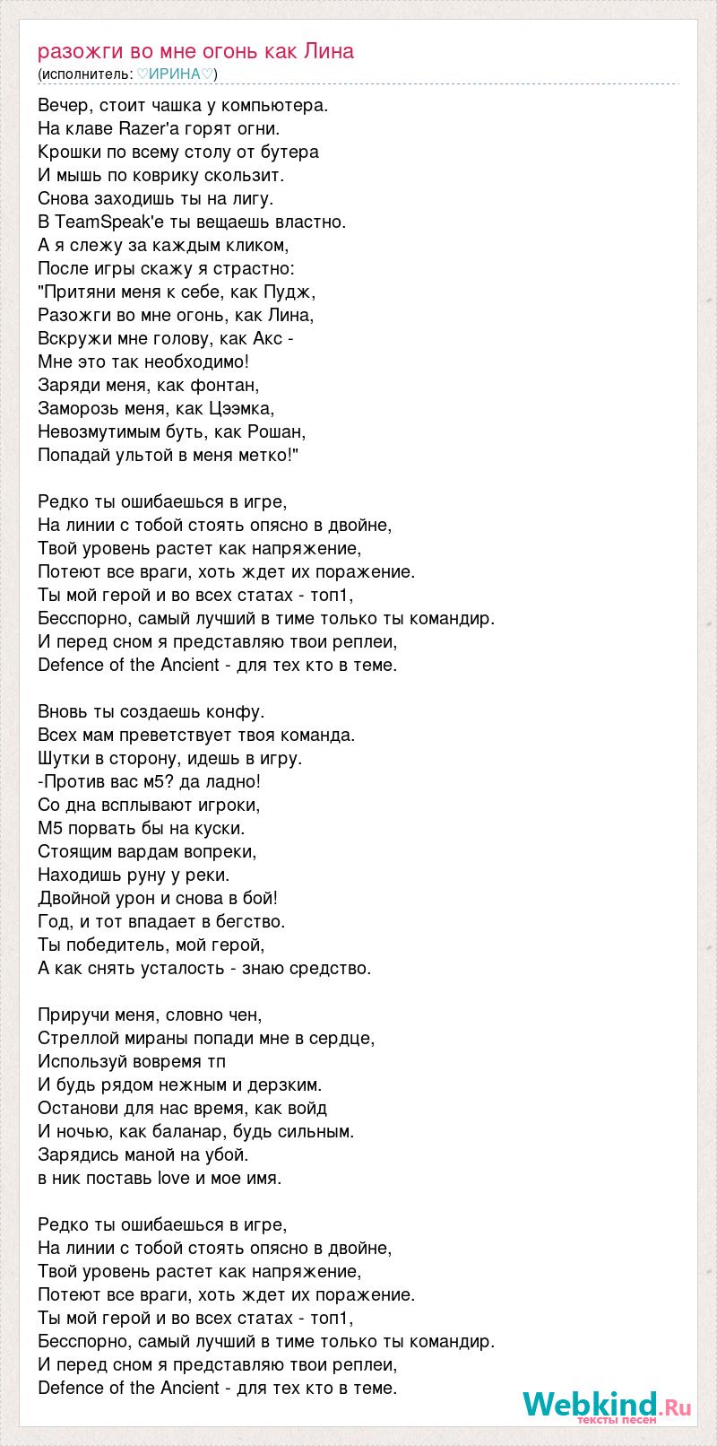 Вечер, стоит чашка у компьютера. На клаве Razer'а горят огни. Крошки по всему столу от бутера И мышь по коврику скользит. Снова заходишь ты на лигу. В TeamSpeak'е ты вещаешь властно. А я слежу за каждым кликом, После игры скажу я страстно: "Притяни меня к себе, как Пудж, Разожги во мне огонь, как Лина, Вскружи мне голову, как Акс - Мне это так необходимо! Заряди меня, как фонтан, Заморозь меня, как Цээмка, Невозмутимым буть, как Рошан, Попадай ультой в меня метко!" Редко ты ошибаешься в игре, На линии с тобой стоять опясно в двойне, Твой уровень растет как напряжение, Потеют все враги, хоть ждет их поражение. Ты мой герой и во всех статах - топ1, Бесспорно, самый лучший в тиме только ты командир. И перед сном я представляю твои реплеи, Defence of the Ancient - для тех кто в теме. Вновь ты создаешь конфу. Всех мам преветствует твоя команда. Шутки в сторону, идешь в игру. -Против вас м5? да ладно! Со дна всплывают игроки, М5 порвать бы на куски. Стоящим вардам вопреки, Находишь руну у реки. Двойной урон и снова в бой! Год, и тот впадает в бегство. Ты победитель, мой герой, А как снять усталость - знаю средство. Приручи меня, словно чен, Стреллой мираны попади мне в сердце, Используй вовремя тп И будь рядом нежным и дерзким. Останови для нас время, как войд И ночью, как баланар, будь сильным. Зарядись маной на убой. в ник поставь love и мое имя. Редко ты ошибаешься в игре, На линии с тобой стоять опясно в двойне, Твой уровень растет как напряжение, Потеют все враги, хоть ждет их поражение. Ты мой герой и во всех статах - топ1, Бесспорно, самый лучший в тиме только ты командир. И перед сном я представляю твои реплеи, Defence of the Ancient - для тех кто в теме.