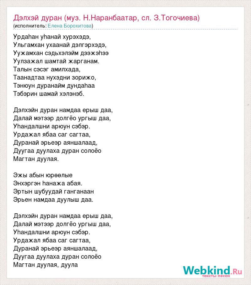 Урдаhан уhанай хурэхэдэ, Ульгамхан ухаанай дэлгэрхэдэ, Уужамхан сэдьхэлэйм дээжэhээ Уулзажал шамтай жарганам. Талын сэсэг амилхада, Таанадтаа нухэдни зорижо, Тэнюун дуранайм дундаhаа Тэбэрин шамай хэлэнэб. Дэлхэйн дуран намдаа ерыш даа, Далай мэтээр долгёо ургыш даа, Уhандалшни арюун сэбэр. Урдажал ябаа саг сагтаа, Дуранай эрьеэр аяншалаад, Дуугаа дуулаха дуран солоёо Магтан дуулая. Эжы абын юрөөлые Энхэргэн hанажа абая. Эртын шубуудай ганганаан Эрьен намдаа дуулыш даа. Дэлхэйн дуран намдаа ерыш даа, Далай мэтээр долгёо ургыш даа, Уhандалшни арюун сэбэр. Урдажал ябаа саг сагтаа, Дуранай эрьеэр аяншалаад, Дуугаа дуулаха дуран солоёо Магтан дуулая, дуула
