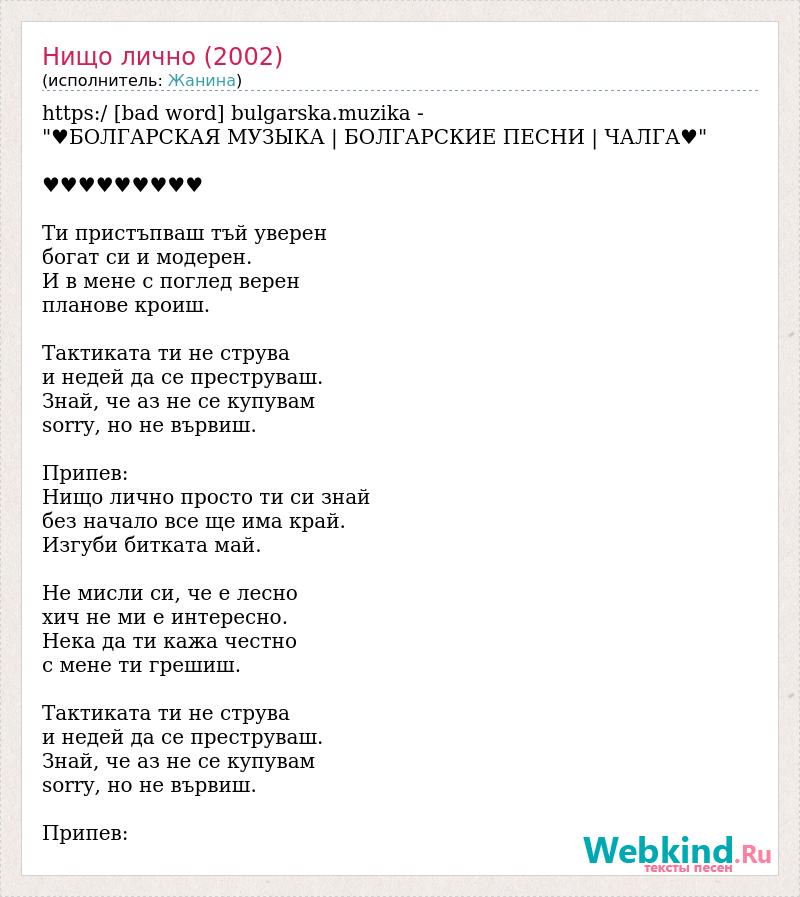 https:/ [bad word] bulgarska.muzika - "♥БОЛГАРСКАЯ МУЗЫКА | БОЛГАРСКИЕ ПЕСНИ | ЧАЛГА♥" ♥♥♥♥♥♥♥♥♥ Ти пристъпваш тъй уверен богат си и модерен. И в мене с поглед верен планове кроиш. Тактиката ти не струва и недей да се преструваш. Знай, че аз не се купувам sorry, но не вървиш. Припев: Нищо лично просто ти си знай без начало все ще има край. Изгуби битката май. Не мисли си, че е лесно хич не ми е интересно. Нека да ти кажа честно с мене ти грешиш. Тактиката ти не струва и недей да се преструваш. Знай, че аз не се купувам sorry, но не вървиш. Припев:
