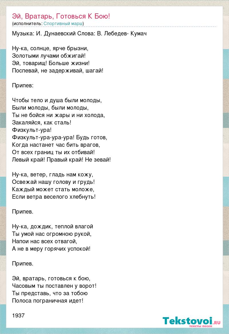 Музыка: И. Дунаевский Слова: В. Лебедев- Кумач Ну-ка, солнце, ярче брызни, Золотыми лучами обжигай! Эй, товарищ! Больше жизни! Поспевай, не задерживай, шагай! Припев: Чтобы тело и душа были молоды, Были молоды, были молоды, Ты не бойся ни жары и ни холода, Закаляйся, как сталь! Физкульт-ура! Физкульт-ура-ура-ура! Будь готов, Когда настанет час бить врагов, От всех границ ты их отбивай! Левый край! Правый край! Не зевай! Ну-ка, ветер, гладь нам кожу, Освежай нашу голову и грудь! Каждый может стать моложе, Если ветра веселого хлебнуть! Припев. Ну-ка, дождик, теплой влагой Ты умой нас огромною рукой, Напои нас всех отвагой, А не в меру горячих успокой! Припев. Эй, вратарь, готовься к бою, Часовым ты поставлен у ворот! Ты представь, что за тобою Полоса пограничная идет! 1937