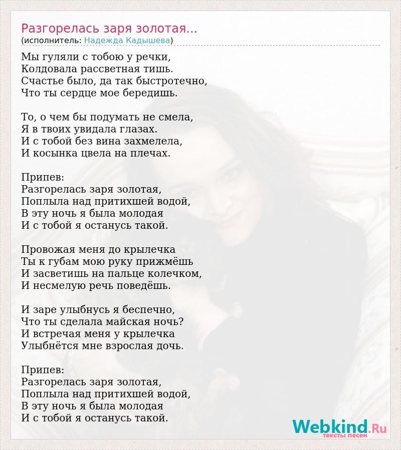 Мы гуляли с тобою у речки, Колдовала рассветная тишь. Счастье было, да так быстротечно, Что ты сердце мое бередишь. То, о чем бы подумать не смела, Я в твоих увидала глазах. И с тобой без вина захмелела, И косынка цвела на плечах. Припев: Разгорелась заря золотая, Поплыла над притихшей водой, В эту ночь я была молодая И с тобой я останусь такой. Провожая меня до крылечка Ты к губам мою руку прижмёшь И засветишь на пальце колечком, И несмелую речь поведёшь. И заре улыбнусь я беспечно, Что ты сделала майская ночь? И встречая меня у крылечка Улыбнётся мне взрослая дочь. Припев: Разгорелась заря золотая, Поплыла над притихшей водой, В эту ночь я была молодая И с тобой я останусь такой.