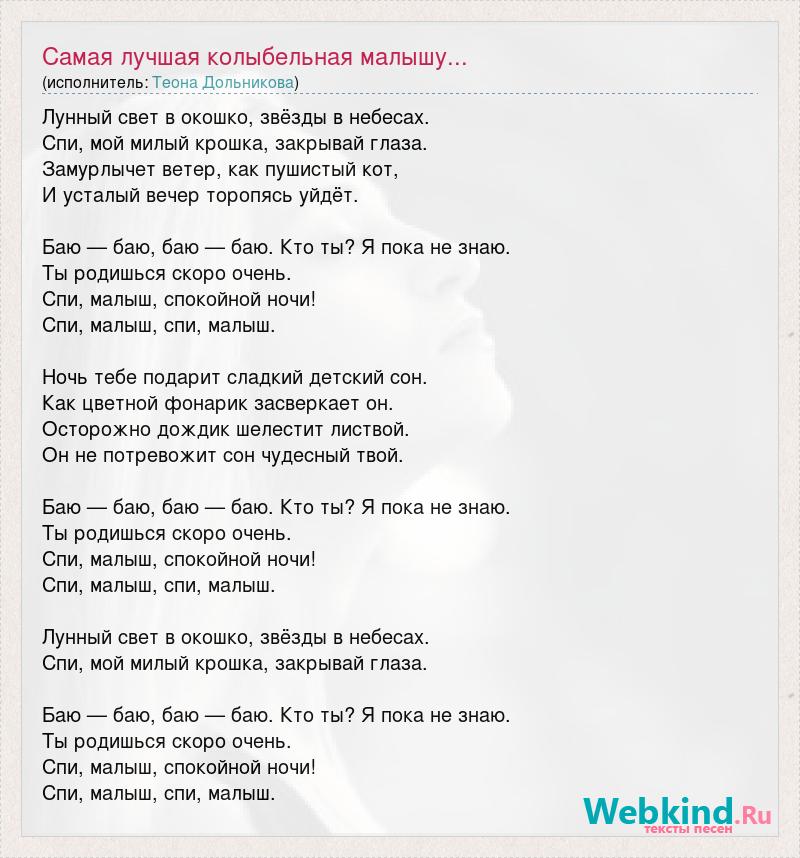 Лунный свет в окошко, звёзды в небесах. Спи, мой милый крошка, закрывай глаза. Замурлычет ветер, как пушистый кот, И усталый вечер торопясь уйдёт. Баю — баю, баю — баю. Кто ты? Я пока не знаю. Ты родишься скоро очень. Спи, малыш, спокойной ночи! Спи, малыш, спи, малыш. Ночь тебе подарит сладкий детский сон. Как цветной фонарик засверкает он. Осторожно дождик шелестит листвой. Он не потревожит сон чудесный твой. Баю — баю, баю — баю. Кто ты? Я пока не знаю. Ты родишься скоро очень. Спи, малыш, спокойной ночи! Спи, малыш, спи, малыш. Лунный свет в окошко, звёзды в небесах. Спи, мой милый крошка, закрывай глаза. Баю — баю, баю — баю. Кто ты? Я пока не знаю. Ты родишься скоро очень. Спи, малыш, спокойной ночи! Спи, малыш, спи, малыш.