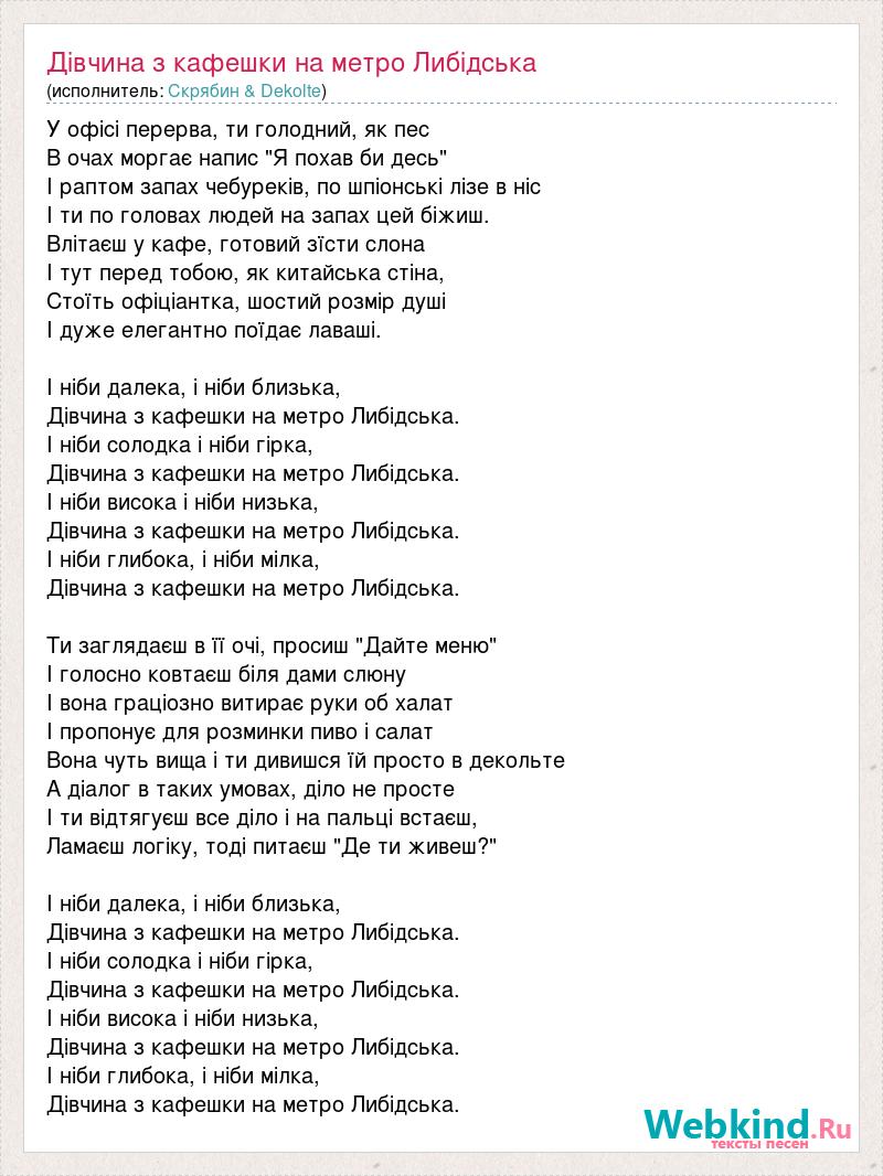 У офісі перерва, ти голодний, як пес В очах моргає напис "Я похав би десь" І раптом запах чебуреків, по шпіонські лізе в ніс І ти по головах людей на запах цей біжиш. Влітаєш у кафе, готовий зїсти слона І тут перед тобою, як китайська стіна, Стоїть офіціантка, шостий розмір душі І дуже елегантно поїдає лаваші. І ніби далека, і ніби близька, Дівчина з кафешки на метро Либідська. І ніби солодка і ніби гірка, Дівчина з кафешки на метро Либідська. І ніби висока і ніби низька, Дівчина з кафешки на метро Либідська. І ніби глибока, і ніби мілка, Дівчина з кафешки на метро Либідська. Ти заглядаєш в її очі, просиш "Дайте меню" І голосно ковтаєш біля дами слюну І вона граціозно витирає руки об халат І пропонує для розминки пиво і салат Вона чуть вища і ти дивишся їй просто в декольте А діалог в таких умовах, діло не просте І ти відтягуєш все діло і на пальці встаєш, Ламаєш логіку, тоді питаєш "Де ти живеш?" І ніби далека, і ніби близька, Дівчина з кафешки на метро Либідська. І ніби солодка і ніби гірка, Дівчина з кафешки на метро Либідська. І ніби висока і ніби низька, Дівчина з кафешки на метро Либідська. І ніби глибока, і ніби мілка, Дівчина з кафешки на метро Либідська.