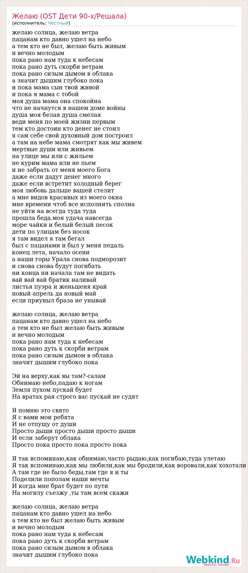 желаю солнца, желаю ветра пацанам кто давно ушел на небо а тем кто не был, желаю быть живым и вечно молодым пока рано нам туда к небесам пока рано дуть скорби ветрам пока рано сизым дымом в облака а значит дышим глубоко пока и пока мама сын твой живой и пока я мама с тобой моя душа мама она спокойна что не начнутся в нашем доме войны душа моя белая душа смелая веди меня по моей жизни первым тем кто достоин кто денег не стоил я сам себе свой духовный дом построил а там на небе мама смотрят как мы живем мертвые души или живьем на улице мы или с жильем не курим мама или не пьем и не забрать от меня моего Бога даже если дадут денег много даже если встретит холодный берег моя любовь дальше вашей стелит а мне видов красивых из моего окна мне времени чтоб все исполнить сполна не уйти на всегда туда туда прошла беда.моя удача навсегда море чайки и белый белый песок дети по улицам без носок я там видел я там бегал был с пацанами и был у меня педаль конец лета, начало осени а наши горы Урала снова подморозит и снова снова будут погибать ни конца ни начала там не видать вай вай вай братик наливай листья пуэра и женьшеня край новый апрель да новый май если приуныл браза не унывай желаю солнца, желаю ветра пацанам кто давно ушел на небо а тем кто не был желаю быть живым и вечно молодым пока рано нам туда к небесам пока рано дуть к скорби ветрам пока рано сизым дымом в облака значит дышим глубоко пока Эй на верху,как вы там?-салам Обнимаю небо,падаю к ногам Земля пухом пускай будет На вратах рая строго вас пускай не судят Я помню это свято Я с вами мои ребята И не отпущу от души Просто дыши просто дыши просто дыши И если заберут облака Просто пока просто пока просто пока Я так вспоминаю,как обнимаю,часто рыдаю,как погибаю,туда улетаю Я так вспоминаю,как мы любили,как мы бродили,как воровали,как хохотали А там где не было беды,там где я и ты Поделили пополам наши мечты И когда мне брат будет по пути На могилу съезжу ,ты там всем скажи желаю солнца, желаю ветра пацанам кто давно ушел на небо а тем кто не был желаю быть живым и вечно молодым пока рано нам туда к небесам пока рано дуть к скорби ветрам пока рано сизым дымом в облака значит дышим глубоко пока