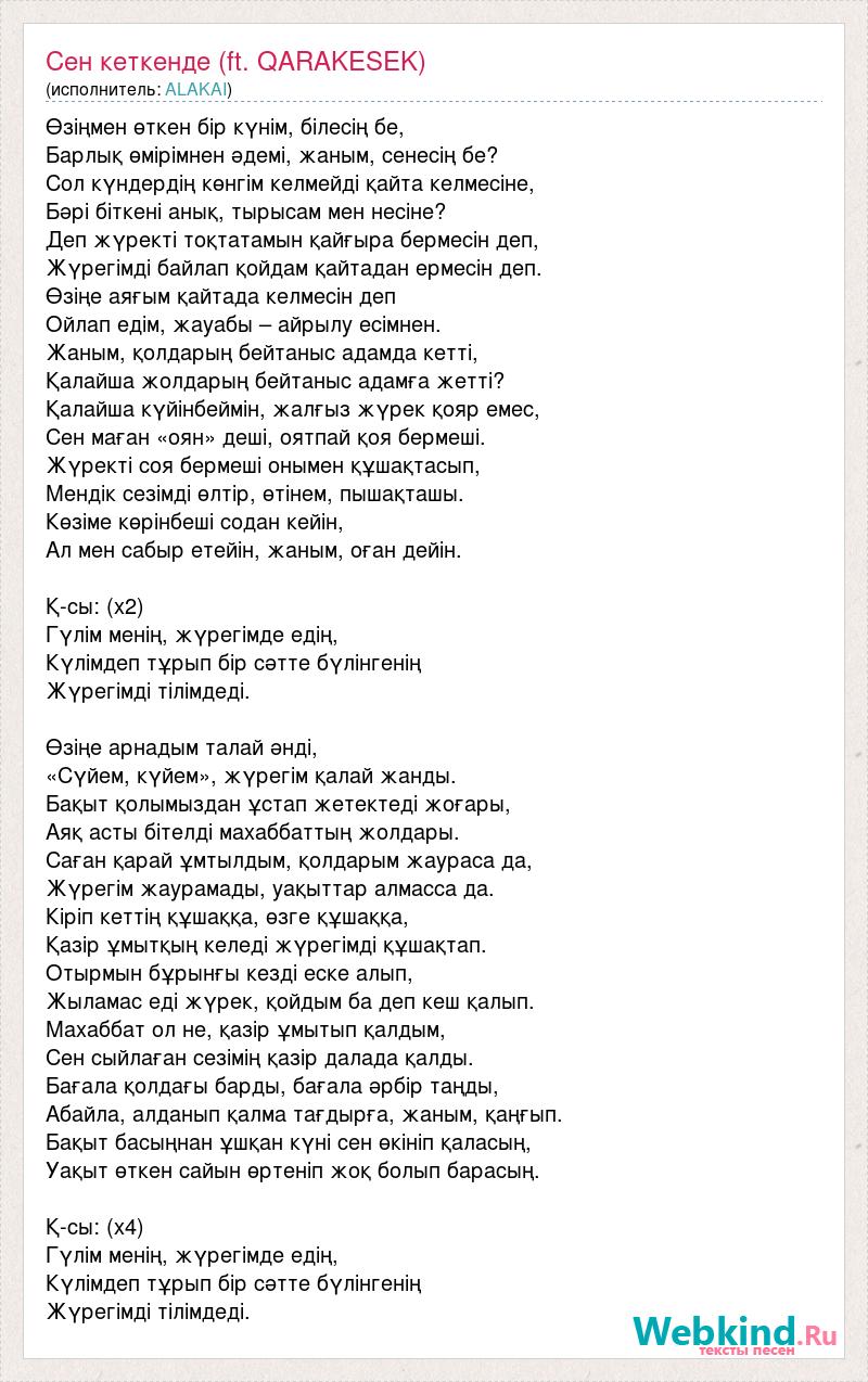 Өзіңмен өткен бір күнім, білесің бе, Барлық өмірімнен әдемі, жаным, сенесің бе? Сол күндердің көнгім келмейді қайта келмесіне, Бәрі біткені анық, тырысам мен несіне? Деп жүректі тоқтатамын қайғыра бермесін деп, Жүрегімді байлап қойдам қайтадан ермесін деп. Өзіңе аяғым қайтада келмесін деп Ойлап едім, жауабы – айрылу есімнен. Жаным, қолдарың бейтаныс адамда кетті, Қалайша жолдарың бейтаныс адамға жетті? Қалайша күйінбеймін, жалғыз жүрек қояр емес, Сен маған «оян» деші, оятпай қоя бермеші. Жүректі соя бермеші онымен құшақтасып, Мендік сезімді өлтір, өтінем, пышақташы. Көзіме көрінбеші содан кейін, Ал мен сабыр етейін, жаным, оған дейін. Қ-сы: (х2) Гүлім менің, жүрегімде едің, Күлімдеп тұрып бір сәтте бүлінгенің Жүрегімді тілімдеді. Өзіңе арнадым талай әнді, «Сүйем, күйем», жүрегім қалай жанды. Бақыт қолымыздан ұстап жетектеді жоғары, Аяқ асты бітелді махаббаттың жолдары. Саған қарай ұмтылдым, қолдарым жаураса да, Жүрегім жаурамады, уақыттар алмасса да. Кіріп кеттің құшаққа, өзге құшаққа, Қазір ұмытқың келеді жүрегімді құшақтап. Отырмын бұрынғы кезді еске алып, Жыламас еді жүрек, қойдым ба деп кеш қалып. Махаббат ол не, қазір ұмытып қалдым, Сен сыйлаған сезімің қазір далада қалды. Бағала қолдағы барды, бағала әрбір таңды, Абайла, алданып қалма тағдырға, жаным, қаңғып. Бақыт басыңнан ұшқан күні сен өкініп қаласың, Уақыт өткен сайын өртеніп жоқ болып барасың. Қ-сы: (х4) Гүлім менің, жүрегімде едің, Күлімдеп тұрып бір сәтте бүлінгенің Жүрегімді тілімдеді.