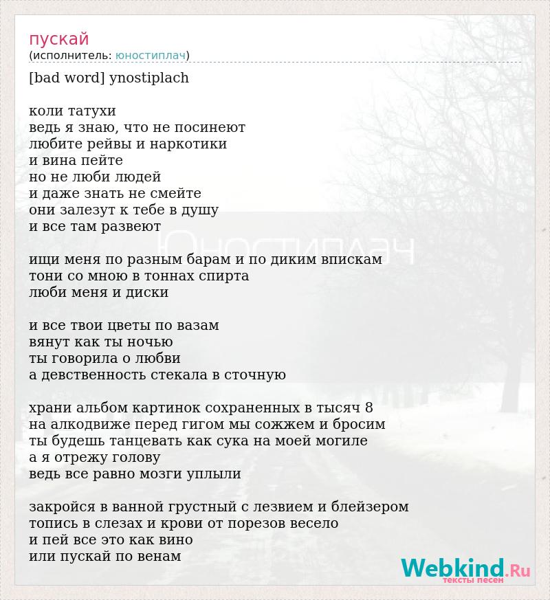 [bad word] ynostiplach коли татухи ведь я знаю, что не посинеют любите рейвы и наркотики и вина пейте но не люби людей и даже знать не смейте они залезут к тебе в душу и все там развеют ищи меня по разным барам и по диким впискам тони со мною в тоннах спирта люби меня и диски и все твои цветы по вазам вянут как ты ночью ты говорила о любви а девственность стекала в сточную храни альбом картинок сохраненных в тысяч 8 на алкодвиже перед гигом мы сожжем и бросим ты будешь танцевать как сука на моей могиле а я отрежу голову ведь все равно мозги уплыли закройся в ванной грустный с лезвием и блейзером топись в слезах и крови от порезов весело и пей все это как вино или пускай по венам