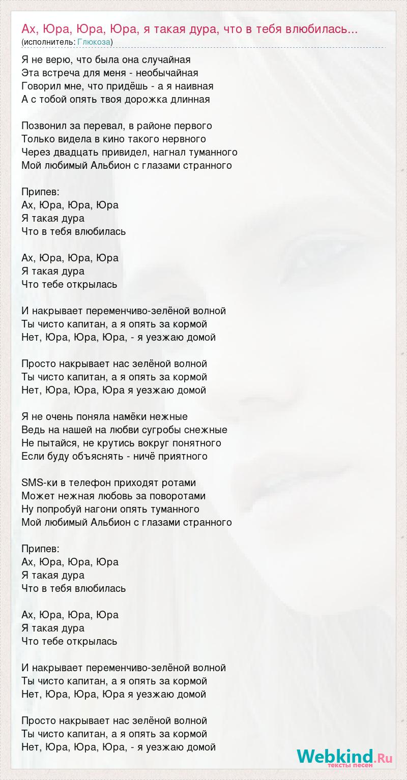 Я не верю, что была она случайная Эта встреча для меня - необычайная Говорил мне, что придёшь - а я наивная А с тобой опять твоя дорожка длинная Позвонил за перевал, в районе первого Только видела в кино такого нервного Через двадцать привидел, нагнал туманного Мой любимый Альбион с глазами странного Припев: Ах, Юра, Юра, Юра Я такая дура Что в тебя влюбилась Ах, Юра, Юра, Юра Я такая дура Что тебе открылась И накрывает переменчиво-зелёной волной Ты чисто капитан, а я опять за кормой Нет, Юра, Юра, Юра, - я уезжаю домой Просто накрывает нас зелёной волной Ты чисто капитан, а я опять за кормой Нет, Юра, Юра, Юра я уезжаю домой Я не очень поняла намёки нежные Ведь на нашей на любви сугробы снежные Не пытайся, не крутись вокруг понятного Если буду объяснять - ничё приятного SMS-ки в телефон приходят ротами Может нежная любовь за поворотами Ну попробуй нагони опять туманного Мой любимый Альбион с глазами странного Припев: Ах, Юра, Юра, Юра Я такая дура Что в тебя влюбилась Ах, Юра, Юра, Юра Я такая дура Что тебе открылась И накрывает переменчиво-зелёной волной Ты чисто капитан, а я опять за кормой Нет, Юра, Юра, Юра я уезжаю домой Просто накрывает нас зелёной волной Ты чисто капитан, а я опять за кормой Нет, Юра, Юра, Юра, - я уезжаю домой