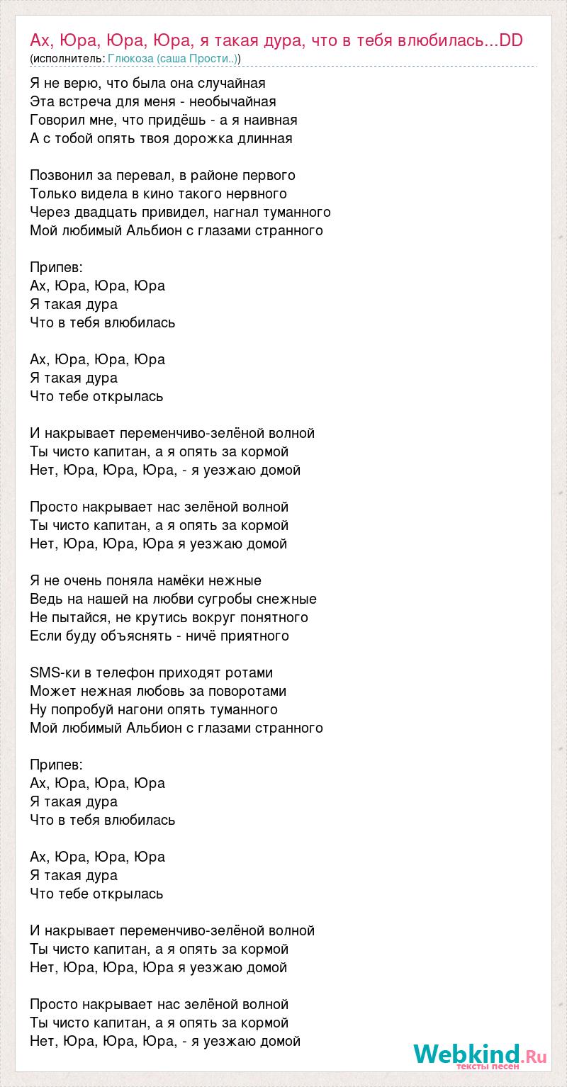 Я не верю, что была она случайная Эта встреча для меня - необычайная Говорил мне, что придёшь - а я наивная А с тобой опять твоя дорожка длинная Позвонил за перевал, в районе первого Только видела в кино такого нервного Через двадцать привидел, нагнал туманного Мой любимый Альбион с глазами странного Припев: Ах, Юра, Юра, Юра Я такая дура Что в тебя влюбилась Ах, Юра, Юра, Юра Я такая дура Что тебе открылась И накрывает переменчиво-зелёной волной Ты чисто капитан, а я опять за кормой Нет, Юра, Юра, Юра, - я уезжаю домой Просто накрывает нас зелёной волной Ты чисто капитан, а я опять за кормой Нет, Юра, Юра, Юра я уезжаю домой Я не очень поняла намёки нежные Ведь на нашей на любви сугробы снежные Не пытайся, не крутись вокруг понятного Если буду объяснять - ничё приятного SMS-ки в телефон приходят ротами Может нежная любовь за поворотами Ну попробуй нагони опять туманного Мой любимый Альбион с глазами странного Припев: Ах, Юра, Юра, Юра Я такая дура Что в тебя влюбилась Ах, Юра, Юра, Юра Я такая дура Что тебе открылась И накрывает переменчиво-зелёной волной Ты чисто капитан, а я опять за кормой Нет, Юра, Юра, Юра я уезжаю домой Просто накрывает нас зелёной волной Ты чисто капитан, а я опять за кормой Нет, Юра, Юра, Юра, - я уезжаю домой