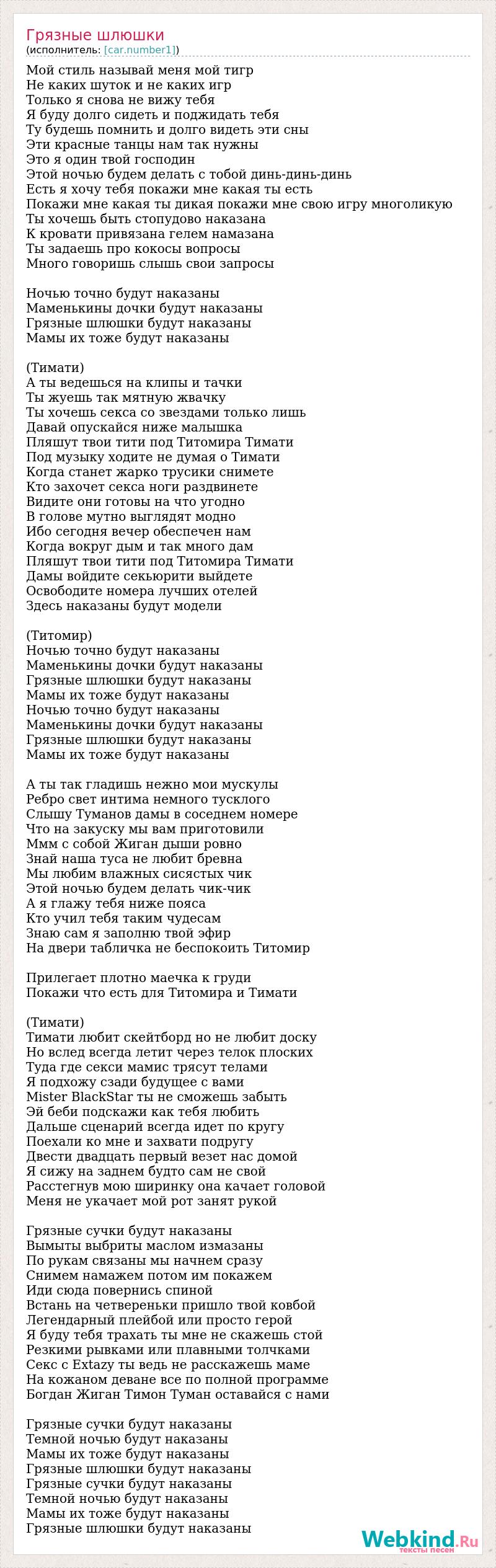 Мой стиль называй меня мой тигр Не каких шуток и не каких игр Только я снова не вижу тебя Я буду долго сидеть и поджидать тебя Ту будешь помнить и долго видеть эти сны Эти красные танцы нам так нужны Это я один твой господин Этой ночью будем делать с тобой динь-динь-динь Есть я хочу тебя покажи мне какая ты есть Покажи мне какая ты дикая покажи мне свою игру многоликую Ты хочешь быть стопудово наказана К кровати привязана гелем намазана Ты задаешь про кокосы вопросы Много говоришь слышь свои запросы Ночью точно будут наказаны Маменькины дочки будут наказаны Грязные шлюшки будут наказаны Мамы их тоже будут наказаны (Тимати) А ты ведешься на клипы и тачки Ты жуешь так мятную жвачку Ты хочешь секса со звездами только лишь Давай опускайся ниже малышка Пляшут твои тити под Титомира Тимати Под музыку ходите не думая о Тимати Когда станет жарко трусики снимете Кто захочет секса ноги раздвинете Видите они готовы на что угодно В голове мутно выглядят модно Ибо сегодня вечер обеспечен нам Когда вокруг дым и так много дам Пляшут твои тити под Титомира Тимати Дамы войдите секьюрити выйдете Освободите номера лучших отелей Здесь наказаны будут модели (Титомир) Ночью точно будут наказаны Маменькины дочки будут наказаны Грязные шлюшки будут наказаны Мамы их тоже будут наказаны Ночью точно будут наказаны Маменькины дочки будут наказаны Грязные шлюшки будут наказаны Мамы их тоже будут наказаны А ты так гладишь нежно мои мускулы Ребро свет интима немного тусклого Слышу Туманов дамы в соседнем номере Что на закуску мы вам приготовили Ммм с собой Жиган дыши ровно Знай наша туса не любит бревна Мы любим влажных сисястых чик Этой ночью будем делать чик-чик А я глажу тебя ниже пояса Кто учил тебя таким чудесам Знаю сам я заполню твой эфир На двери табличка не беспокоить Титомир Прилегает плотно маечка к груди Покажи что есть для Титомира и Тимати (Тимати) Тимати любит скейтборд но не любит доску Но вслед всегда летит через телок плоских Туда где секси мамис трясут телами Я подхожу сзади будущее с вами Mister BlackStar ты не сможешь забыть Эй беби подскажи как тебя любить Дальше сценарий всегда идет по кругу Поехали ко мне и захвати подругу Двести двадцать первый везет нас домой Я сижу на заднем будто сам не свой Расстегнув мою ширинку она качает головой Меня не укачает мой рот занят рукой Грязные сучки будут наказаны Вымыты выбриты маслом измазаны По рукам связаны мы начнем сразу Снимем намажем потом им покажем Иди сюда повернись спиной Встань на четвереньки пришло твой ковбой Легендарный плейбой или просто герой Я буду тебя трахать ты мне не скажешь стой Резкими рывками или плавными толчками Секс с Extazy ты ведь не расскажешь маме На кожаном деване все по полной программе Богдан Жиган Тимон Туман оставайся с нами Грязные сучки будут наказаны Темной ночью будут наказаны Мамы их тоже будут наказаны Грязные шлюшки будут наказаны Грязные сучки будут наказаны Темной ночью будут наказаны Мамы их тоже будут наказаны Грязные шлюшки будут наказаны