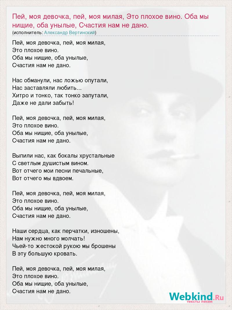 Пей, моя девочка, пей, моя милая, Это плохое вино. Оба мы нищие, оба унылые, Счастия нам не дано. Нас обманули, нас ложью опутали, Нас заставляли любить... Хитро и тонко, так тонко запутали, Даже не дали забыть! Пей, моя девочка, пей, моя милая, Это плохое вино. Оба мы нищие, оба унылые, Счастия нам не дано. Выпили нас, как бокалы хрустальные С светлым душистым вином. Вот отчего мои песни печальные, Вот отчего мы вдвоем. Пей, моя девочка, пей, моя милая, Это плохое вино. Оба мы нищие, оба унылые, Счастия нам не дано. Наши сердца, как перчатки, изношены, Нам нужно много молчать! Чьей-то жестокой рукою мы брошены В эту большую кровать. Пей, моя девочка, пей, моя милая, Это плохое вино. Оба мы нищие, оба унылые, Счастия нам не дано.