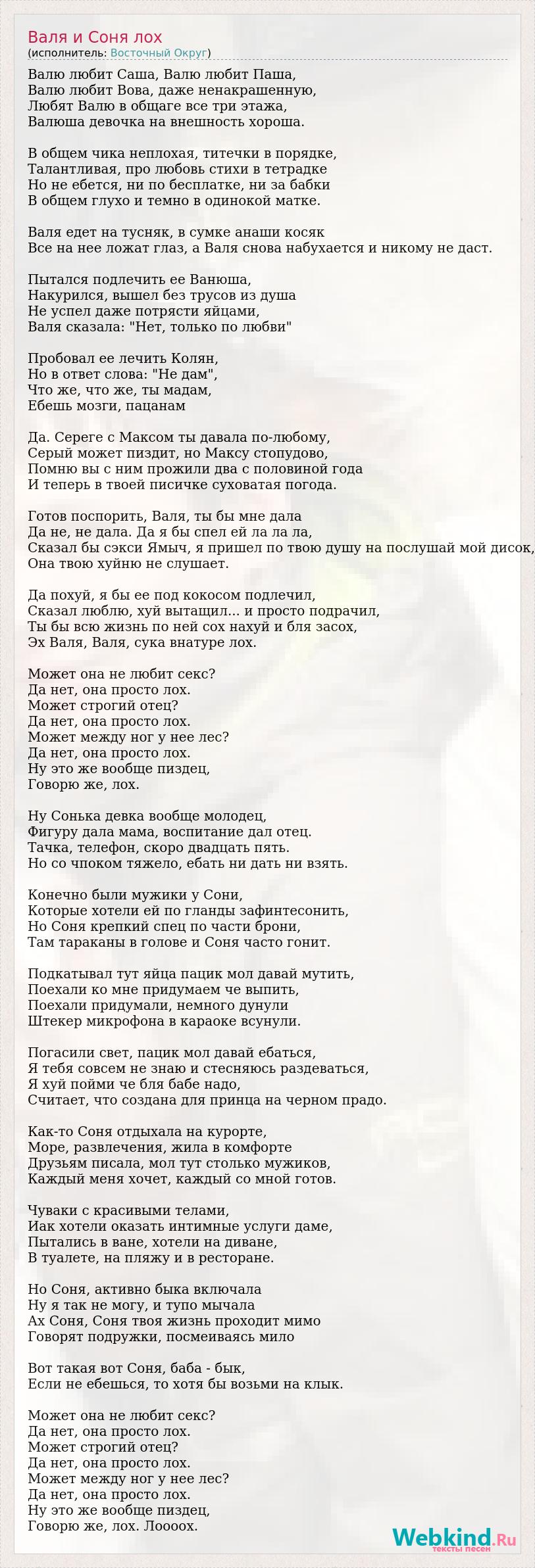 Валю любит Саша, Валю любит Паша, Валю любит Вова, даже ненакрашенную, Любят Валю в общаге все три этажа, Валюша девочка на внешность хороша. В общем чика неплохая, титечки в порядке, Талантливая, про любовь стихи в тетрадке Но не ебется, ни по бесплатке, ни за бабки В общем глухо и темно в одинокой матке. Валя едет на тусняк, в сумке анаши косяк Все на нее ложат глаз, а Валя снова набухается и никому не даст. Пытался подлечить ее Ванюша, Накурился, вышел без трусов из душа Не успел даже потрясти яйцами, Валя сказала: "Нет, только по любви" Пробовал ее лечить Колян, Но в ответ слова: "Не дам", Что же, что же, ты мадам, Ебешь мозги, пацанам Да. Сереге с Максом ты давала по-любому, Серый может пиздит, но Максу стопудово, Помню вы с ним прожили два с половиной года И теперь в твоей писичке суховатая погода. Готов поспорить, Валя, ты бы мне дала Да не, не дала. Да я бы спел ей ла ла ла, Сказал бы сэкси Ямыч, я пришел по твою душу на послушай мой дисок, Она твою хуйню не слушает. Да похуй, я бы ее под кокосом подлечил, Сказал люблю, хуй вытащил... и просто подрачил, Ты бы всю жизнь по ней сох нахуй и бля засох, Эх Валя, Валя, сука внатуре лох. Может она не любит секс? Да нет, она просто лох. Может строгий отец? Да нет, она просто лох. Может между ног у нее лес? Да нет, она просто лох. Ну это же вообще пиздец, Говорю же, лох. Ну Сонька девка вообще молодец, Фигуру дала мама, воспитание дал отец. Тачка, телефон, скоро двадцать пять. Но со чпоком тяжело, ебать ни дать ни взять. Конечно были мужики у Сони, Которые хотели ей по гланды зафинтесонить, Но Соня крепкий спец по части брони, Там тараканы в голове и Соня часто гонит. Подкатывал тут яйца пацик мол давай мутить, Поехали ко мне придумаем че выпить, Поехали придумали, немного дунули Штекер микрофона в караоке всунули. Погасили свет, пацик мол давай ебаться, Я тебя совсем не знаю и стесняюсь раздеваться, Я хуй пойми че бля бабе надо, Считает, что создана для принца на черном прадо. Как-то Соня отдыхала на курорте, Море, развлечения, жила в комфорте Друзьям писала, мол тут столько мужиков, Каждый меня хочет, каждый со мной готов. Чуваки с красивыми телами, Иак хотели оказать интимные услуги даме, Пытались в ване, хотели на диване, В туалете, на пляжу и в ресторане. Но Соня, активно быка включала Ну я так не могу, и тупо мычала Ах Соня, Соня твоя жизнь проходит мимо Говорят подружки, посмеиваясь мило Вот такая вот Соня, баба - бык, Если не ебешься, то хотя бы возьми на клык. Может она не любит секс? Да нет, она просто лох. Может строгий отец? Да нет, она просто лох. Может между ног у нее лес? Да нет, она просто лох. Ну это же вообще пиздец, Говорю же, лох. Лоооох.