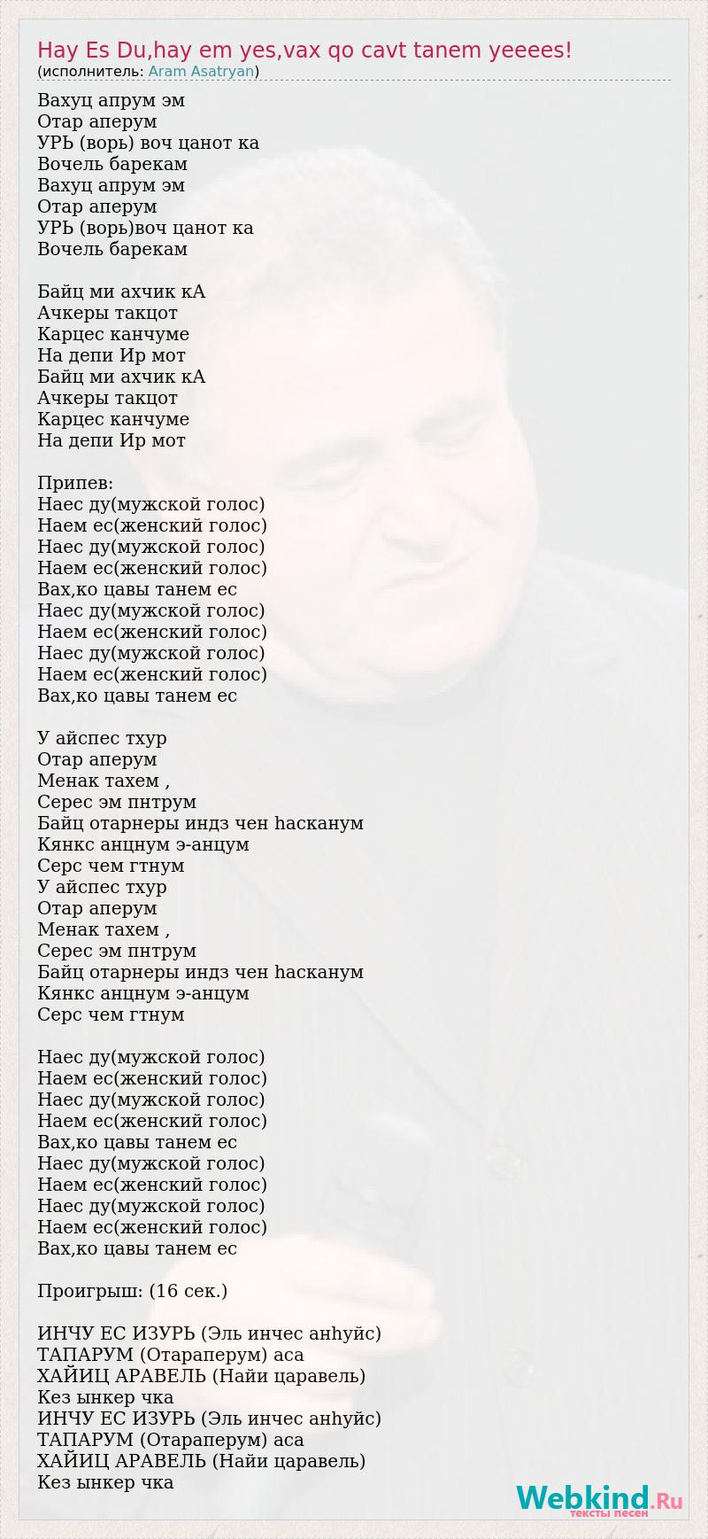 Вахуц апрум эм Отар аперум УРЬ (ворь) воч цанот ка Вочель барекам Вахуц апрум эм Отар аперум УРЬ (ворь)воч цанот ка Вочель барекам Байц ми ахчик кА Ачкеры такцот Карцес канчуме На депи Ир мот Байц ми ахчик кА Ачкеры такцот Карцес канчуме На депи Ир мот Припев: Hаес ду(мужской голос) Hаем ес(женский голос) Hаес ду(мужской голос) Hаем ес(женский голос) Вах,ко цавы танем ес Hаес ду(мужской голос) Hаем ес(женский голос) Hаес ду(мужской голос) Hаем ес(женский голос) Вах,ко цавы танем ес У айспес тхур Отар аперум Менак тахем , Серес эм пнтрум Байц отарнеры индз чен hасканум Кянкс анцнум э-анцум Серс чем гтнум У айспес тхур Отар аперум Менак тахем , Серес эм пнтрум Байц отарнеры индз чен hасканум Кянкс анцнум э-анцум Серс чем гтнум Hаес ду(мужской голос) Hаем ес(женский голос) Hаес ду(мужской голос) Hаем ес(женский голос) Вах,ко цавы танем ес Hаес ду(мужской голос) Hаем ес(женский голос) Hаес ду(мужской голос) Hаем ес(женский голос) Вах,ко цавы танем ес Проигрыш: (16 сек.) ИНЧУ ЕС ИЗУРЬ (Эль инчес анhуйс) ТАПАРУМ (Отараперум) аса ХАЙИЦ АРАВЕЛЬ (Hайи царавель) Кез ынкер чка ИНЧУ ЕС ИЗУРЬ (Эль инчес анhуйс) ТАПАРУМ (Отараперум) аса ХАЙИЦ АРАВЕЛЬ (Hайи царавель) Кез ынкер чка