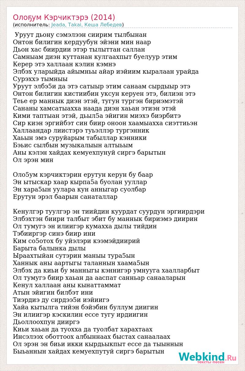 Уруут дьону сэмэлээн сиирим тылбынан Онтон билигин кердуубун эйэни мин наар Дьон хас биирдии этэр тылыттан саллан Самныам диэн куттанан кулгаахпыт буелуур этим Керер этэ халлаан кэлин кэмнэ Элбэх уларыйда айымньы айар иэйиим кыралаан урайда Сурэххэ тымныы Уруут элбэ5и да этэ сатыыр этим санаам сырдыыр этэ Онтон билигин кистиибин уксун керуен этэ, билиэн этэ Теье ер маннык диэн этэй, тугун тургэн бириэмэтэй Сананы хамсатыахха наада диэн хаьан этиэн этэй Кими таптыан этэй, дьыл5а эйигин миэхэ биэрбитэ Сир киэн эргийбэт син биир оноон хаамыахха сиэттиьэн Халлаандар лиистэрэ туьэллэр тургэнник Хаьын эмэ суруйарым табыллар кэнники Бэьис сылбын музыкалыын алтыьым Аны кэлэн хайдах кемуехпунуй сиргэ барытын Ол эрэн мин Оло5ум кэрчиктэрин ерутун керун бу баар Эн ытыскар хаар кырпа5а буолан ууллар Эн хара5ын уулара кун анныгар суолбар Ерутун эрэл баарын санаталлар Кенулгэр туулгэр эн тиийдин куурдат суурдун эргиирдэри Элбэхтэн биири талбыт эбит бу маннык бириэмэ диирин Ол тумугэ эн илиигэр кумахха дылы тийдин Тэбииргэр синэ биир ини Ким со5отох бу уйэлэри кээмэйдиирий Барыта балынка дылы Ыраахтыйан сутэрин маныы тура5ын Ханнык аны аартыгы таланнын хаама5ын Элбэх да киьи бу манныгы кэннигэр умнууга хаалларбыт Ол тумугэ биир хаьан да ааспат санньар санааларын Кенул халлаан аны кынаттаммат Атын эйигин билбэт ини Тиэрдиэ ду сирдээ5и иэйиигэ Хайа кытылга тийэн бэйэбин буллум диигин Эн илиигэр кэскилин ессе тугу ирдиигин Дьоллоохпун дииргэ Киьи хаьан да туохха да туолбат харахтаах Инсэлээх оботтоох албыннаах быстах санаалаах Ол эрэн эн биьи икки кырдьыкпыт ессе да тыыннын Быьаннын хайдах кемуехпутуй сиргэ барытын