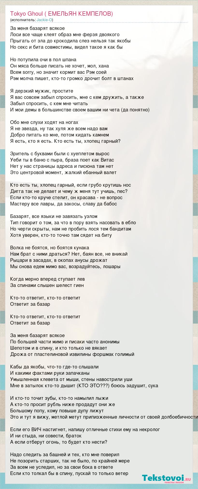 За меня базарят всякое Лоси все чаще клеят образ мне ферзя двоякого Прыгать от зла до крокодила слез нельзя так якобы Но секс и бита совместимы, видел такое я как бы Но потупила очи в пол шпана Он мяса больше писать не хочет, мол, хана Всем sorry, но значит кормит вас Рэм соей Рэм молча пишет, кто-то громко дрочит болт в штанах Я дерзкий мужик, простите Я вас совсем забыл спросить, мне с кем дружить, а также Забыл спросить, с кем мне читать И мои демы в большинстве своем вашим ни чета (да понятно) Обо мне слухи ходят на ногах Я не звезда, ну так хуля же всем надо вам Добро питать ко мне, потом кидать камнем Я есть, кто я есть. Кто есть ты, хлопец гарный? Зритель с буквами были с хуеплетом вырос Уеби ты в баню с пыра, браза поет как Витас Нет у нас страницы адреса и писюна там нет Это центровой момент, жалкий ебанный валет Кто есть ты, хлопец гарный, если грубо крутишь нос Дигга так не делает и чему ж меня тут учишь, пес? Если кто-то круче стелит, он красава - не вопрос Мастеру все лавры, да закосы, славу да бабос Базарят, все языки не завязать узлом Тип говорит о том, за что в пору взять насовать в ебло Но черти скрыты, нам не пробить лося тем бандитам Хотя уверен, кто-то точно там сядет на биту Волка не боятся, но боятся кунака Нам брат с ними драться? Нет, баян все, не вникай Рыцари в засадах, в окопах анусы дрожат Мы снова едем мимо вас, возрадуйтесь, лошары Когда мерно вперед ступает лев За спинами слышен шелест гиен Кто-то ответит, кто-то ответит Ответит за базар Кто-то ответит, кто-то ответит Ответит за базар За меня базарят всякое По большей части мимо и писаки часто анонимы Шепотом и в спину, и кто только не вякает Дрожа от пластелиновой извилины форшмак голимый Кабы да якобы, что-то где-то слышали И какими фактами руки запачканы Умышленная клевета от мыши, стены навострили уши Мне в затылок кто-то дышит (КТО ЭТО???) боюсь задушит, сука И кто-то точит зубы, кто-то намылил лыжи А кто-то просит рубль ниже продадут они же Большому попу, кому повыше дупу лижут Это и тут я вижу, метлой метут припизженные личности от своей долбоебичности Если его ВИЧ настигнет, напишу отличные стихи ему на некролог И ни стыда, ни совести, браток А если отберут огонь, то будет кто нести? Надо следить за башней и тех, кто мне поверил Не позорить старших, так не было, по крайней мере За всем не уследил, но за свои бока в ответе Если кто толкал бы в спину, пускай то только ветер