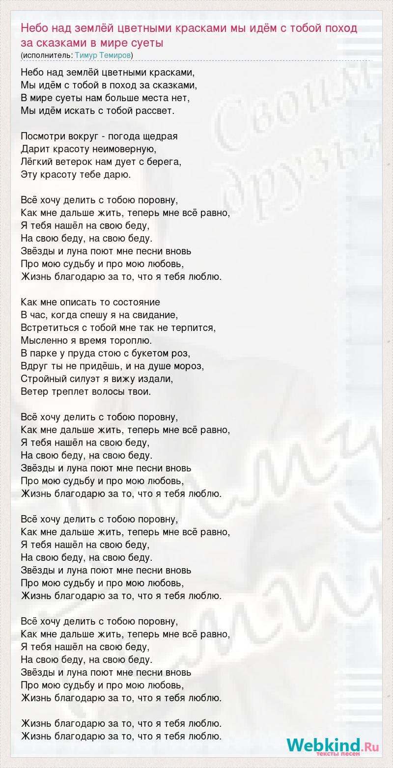 Небо над землёй цветными красками, Мы идём с тобой в поход за сказками, В мире суеты нам больше места нет, Мы идём искать с тобой рассвет. Посмотри вокруг - погода щедрая Дарит красоту неимоверную, Лёгкий ветерок нам дует с берега, Эту красоту тебе дарю. Всё хочу делить с тобою поровну, Как мне дальше жить, теперь мне всё равно, Я тебя нашёл на свою беду, На свою беду, на свою беду. Звёзды и луна поют мне песни вновь Про мою судьбу и про мою любовь, Жизнь благодарю за то, что я тебя люблю. Как мне описать то состояние В час, когда спешу я на свидание, Встретиться с тобой мне так не терпится, Мысленно я время тороплю. В парке у пруда стою с букетом роз, Вдруг ты не придёшь, и на душе мороз, Стройный силуэт я вижу издали, Ветер треплет волосы твои. Всё хочу делить с тобою поровну, Как мне дальше жить, теперь мне всё равно, Я тебя нашёл на свою беду, На свою беду, на свою беду. Звёзды и луна поют мне песни вновь Про мою судьбу и про мою любовь, Жизнь благодарю за то, что я тебя люблю. Всё хочу делить с тобою поровну, Как мне дальше жить, теперь мне всё равно, Я тебя нашёл на свою беду, На свою беду, на свою беду. Звёзды и луна поют мне песни вновь Про мою судьбу и про мою любовь, Жизнь благодарю за то, что я тебя люблю. Всё хочу делить с тобою поровну, Как мне дальше жить, теперь мне всё равно, Я тебя нашёл на свою беду, На свою беду, на свою беду. Звёзды и луна поют мне песни вновь Про мою судьбу и про мою любовь, Жизнь благодарю за то, что я тебя люблю. Жизнь благодарю за то, что я тебя люблю. Жизнь благодарю за то, что я тебя люблю.