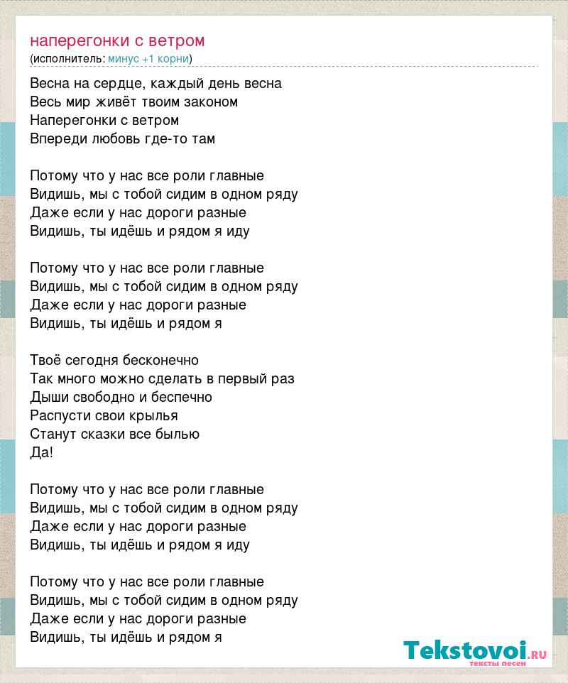 Весна на сердце, каждый день весна Весь мир живёт твоим законом Наперегонки с ветром Впереди любовь где-то там Потому что у нас все роли главные Видишь, мы с тобой сидим в одном ряду Даже если у нас дороги разные Видишь, ты идёшь и рядом я иду Потому что у нас все роли главные Видишь, мы с тобой сидим в одном ряду Даже если у нас дороги разные Видишь, ты идёшь и рядом я Твоё сегодня бесконечно Так много можно сделать в первый раз Дыши свободно и беспечно Распусти свои крылья Станут сказки все былью Да! Потому что у нас все роли главные Видишь, мы с тобой сидим в одном ряду Даже если у нас дороги разные Видишь, ты идёшь и рядом я иду Потому что у нас все роли главные Видишь, мы с тобой сидим в одном ряду Даже если у нас дороги разные Видишь, ты идёшь и рядом я