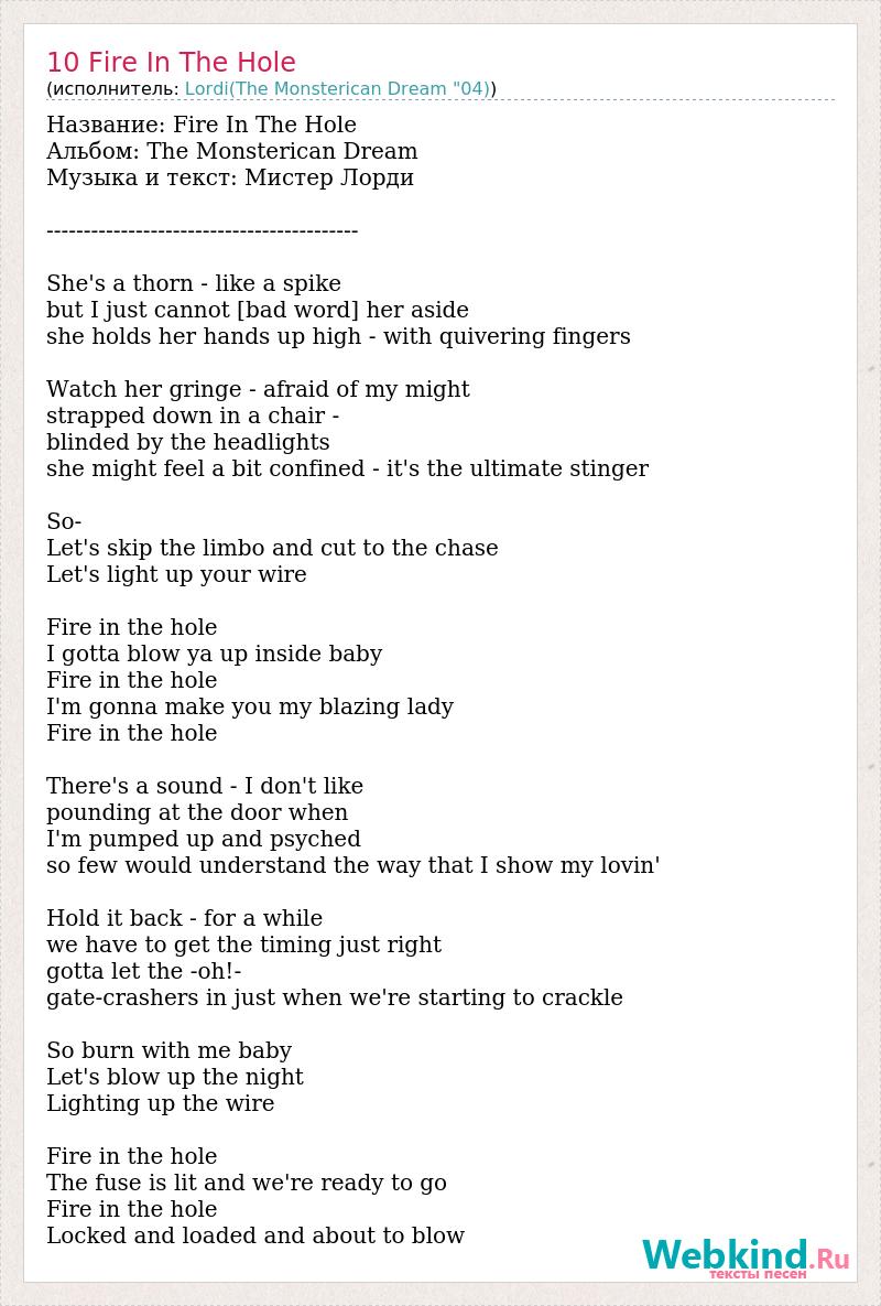 Название: Fire In The Hole Альбом: The Monsterican Dream Музыка и текст: Мистер Лорди ------------------------------------------ She's a thorn - like a spike but I just cannot [bad word] her aside she holds her hands up high - with quivering fingers Watch her gringe - afraid of my might strapped down in a chair - blinded by the headlights she might feel a bit confined - it's the ultimate stinger So- Let's skip the limbo and cut to the chase Let's light up your wire Fire in the hole I gotta blow ya up inside baby Fire in the hole I'm gonna make you my blazing lady Fire in the hole There's a sound - I don't like pounding at the door when I'm pumped up and psyched so few would understand the way that I show my lovin' Hold it back - for a while we have to get the timing just right gotta let the -oh!- gate-crashers in just when we're starting to crackle So burn with me baby Let's blow up the night Lighting up the wire Fire in the hole The fuse is lit and we're ready to go Fire in the hole Locked and loaded and about to blow