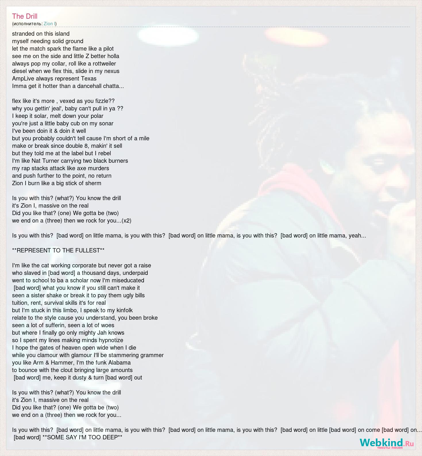 stranded on this island myself needing solid ground let the match spark the flame like a pilot see me on the side and little Z better holla always pop my collar, roll like a rottweiler diesel when we flex this, slide in my nexus AmpLive always represent Texas Imma get it hotter than a dancehall chatta... flex like it's more , vexed as you fizzle?? why you gettin' jeal', baby can't pull in ya ?? I keep it solar, melt down your polar you're just a little baby cub on my sonar I've been doin it & doin it well but you probably couldn't tell cause I'm short of a mile make or break since double 8, makin' it sell but they told me at the label but I rebel I'm like Nat Turner carrying two black burners my rap stacks attack like axe murders and push further to the point, no return Zion I burn like a big stick of sherm Is you with this? (what?) You know the drill it's Zion I, massive on the real Did you like that? (one) We gotta be (two) we end on a (three) then we rock for you...(x2) Is you with this? [bad word] on little mama, is you with this? [bad word] on little mama, is you with this? [bad word] on little mama, yeah... **REPRESENT TO THE FULLEST** I'm like the cat working corporate but never got a raise who slaved in [bad word] a thousand days, underpaid went to school to ba a scholar now I'm miseducated [bad word] what you know if you still can't make it seen a sister shake or break it to pay them ugly bills tuition, rent, survival skills it's for real but I'm stuck in this limbo, I speak to my kinfolk relate to the style cause you understand, you been broke seen a lot of sufferin, seen a lot of woes but where I finally go only mighty Jah knows so I spent my lines making minds hypnotize I hope the gates of heaven open wide when I die while you clamour with glamour I'll be stammering grammer you like Arm & Hammer, I'm the funk Alabama to bounce with the clout bringing large amounts [bad word] me, keep it dusty & turn [bad word] out Is you with this? (what?) You know the drill it's Zion I, massive on the real Did you like that? (one) We gotta be (two) we end on a (three) then we rock for you... Is you with this? [bad word] on little mama, is you with this? [bad word] on little mama, is you with this? [bad word] on little [bad word] on come [bad word] on... [bad word] **SOME SAY I'M TOO DEEP**