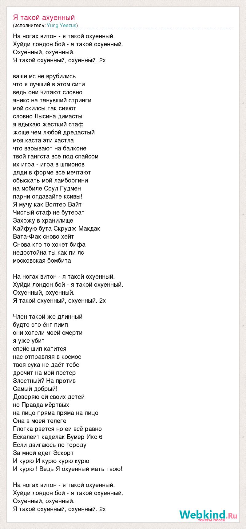 На ногах витон - я такой охуенный. Хуйди лондон бой - я такой охуенный. Охуенный, охуенный. Я такой охуенный, охуенный. 2x ваши мс не врубились что я лучший в этом сити ведь они читают словно яникс на тянувший стринги мой скилсы так сияют словно Лысина димасты я вдыхаю жесткий стаф жоще чем любой дредастый моя каста эти хастла что взрывают на балконе твой гангста все под спайсом их игра - игра в шпионов дяди в форме все мечтают обыскать мой ламборгини на мобиле Соул Гудмен парни отдавайте ксивы! Я мучу как Волтер Вайт Чистый стаф не бутерат Захожу в хранилище Кайфую бута Скрудж Макдак Вата-Фак сново хейт Снова кто то хочет бифа недостойна ты как пи лс московская бомбита На ногах витон - я такой охуенный. Хуйди лондон бой - я такой охуенный. Охуенный, охуенный. Я такой охуенный, охуенный. 2x Член такой же длинный будто это ёнг пимп они хотели моей смерти я уже убит спейс шип катится нас отправляя в космос твоя сука не даёт тебе дрочит на мой постер Злостный? На против Самый добрый! Доверяю ей своих детей но Правда мёртвых на лицо пряма пряма на лицо Она в моей телеге Глотка рвется но ей всё равно Ескалейт каделак Бумер Икс 6 Если двигаюсь по городу За мной едет Эскорт И курю И курю курю курю И курю ! Ведь Я охуенный мать твою! На ногах витон - я такой охуенный. Хуйди лондон бой - я такой охуенный. Охуенный, охуенный. Я такой охуенный, охуенный. 2x
