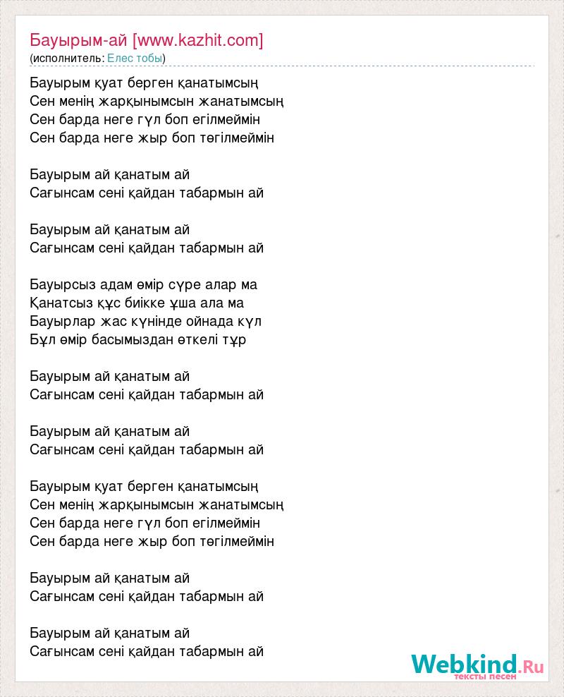 Бауырым қуат берген қанатымсың Сен менің жарқынымсын жанатымсың Сен барда неге гүл боп егілмеймін Сен барда неге жыр боп төгілмеймін Бауырым ай қанатым ай Сағынсам сені қайдан табармын ай Бауырым ай қанатым ай Сағынсам сені қайдан табармын ай Бауырсыз адам өмір сүре алар ма Қанатсыз құс биікке ұша ала ма Бауырлар жас күнінде ойнада күл Бұл өмір басымыздан өткелі тұр Бауырым ай қанатым ай Сағынсам сені қайдан табармын ай Бауырым ай қанатым ай Сағынсам сені қайдан табармын ай Бауырым қуат берген қанатымсың Сен менің жарқынымсын жанатымсың Сен барда неге гүл боп егілмеймін Сен барда неге жыр боп төгілмеймін Бауырым ай қанатым ай Сағынсам сені қайдан табармын ай Бауырым ай қанатым ай Сағынсам сені қайдан табармын ай