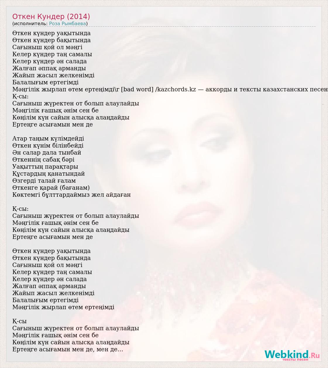 Өткен күндер уақытында Өткен күндер бақытында Сағыныш қой ол мәңгі Келер күндер таң самалы Келер күндер ән салада Жалғап әппақ арманды Жайып жасыл желкенімді Балалығым ертегімді Мәңгілік жырлап өтем ертеңімді\r [bad word] /kazchords.kz — аккорды и тексты казахстанских песен Қ-сы: Сағыныш жүректен от болып алаулайды Мәңгілік ғашық әнім сен бе Көңілім күн сайын алысқа алаңдайды Ертеңге асығамын мен де Атар таңым күлімдейді Өткен күнім білінбейді Ән салар дала тынбай Өткеннің сабақ бәрі Уақыттың парақтары Құстардың қанатындай Өзгерді талай ғалам Өткенге қарай (бағанам) Көктемгі бұлттардаймыз жел айдаған Қ-сы: Сағыныш жүректен от болып алаулайды Мәңгілік ғашық әнім сен бе Көңілім күн сайын алысқа алаңдайды Ертеңге асығамын мен де Өткен күндер уақытында Өткен күндер бақытында Сағыныш қой ол мәңгі Келер күндер таң самалы Келер күндер ән салада Жалғап әппақ арманды Жайып жасыл желкенімді Балалығым ертегімді Мәңгілік жырлап өтем ертеңімді Қ-сы Сағыныш жүректен от болып алаулайды Мәңгілік ғашық әнім сен бе Көңілім күн сайын алысқа алаңдайды Ертеңге асығамын мен де, мен де…