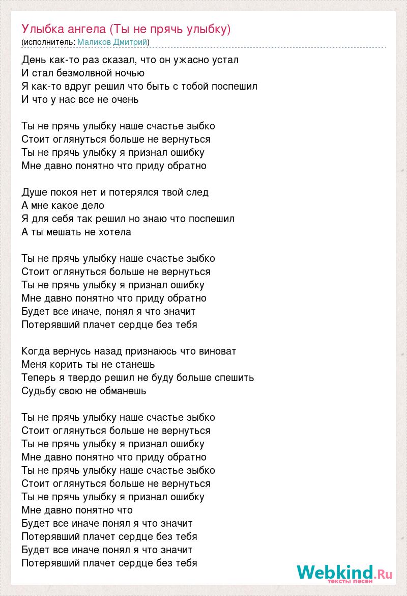 День как-то раз сказал, что он ужасно устал И стал безмолвной ночью Я как-то вдруг решил что быть с тобой поспешил И что у нас все не очень Ты не прячь улыбку наше счастье зыбко Стоит оглянуться больше не вернуться Ты не прячь улыбку я признал ошибку Мне давно понятно что приду обратно Душе покоя нет и потерялся твой след А мне какое дело Я для себя так решил но знаю что поспешил А ты мешать не хотела Ты не прячь улыбку наше счастье зыбко Стоит оглянуться больше не вернуться Ты не прячь улыбку я признал ошибку Мне давно понятно что приду обратно Будет все иначе, понял я что значит Потерявший плачет сердце без тебя Когда вернусь назад признаюсь что виноват Меня корить ты не станешь Теперь я твердо решил не буду больше спешить Судьбу свою не обманешь Ты не прячь улыбку наше счастье зыбко Стоит оглянуться больше не вернуться Ты не прячь улыбку я признал ошибку Мне давно понятно что приду обратно Ты не прячь улыбку наше счастье зыбко Стоит оглянуться больше не вернуться Ты не прячь улыбку я признал ошибку Мне давно понятно что Будет все иначе понял я что значит Потерявший плачет сердце без тебя Будет все иначе понял я что значит Потерявший плачет сердце без тебя