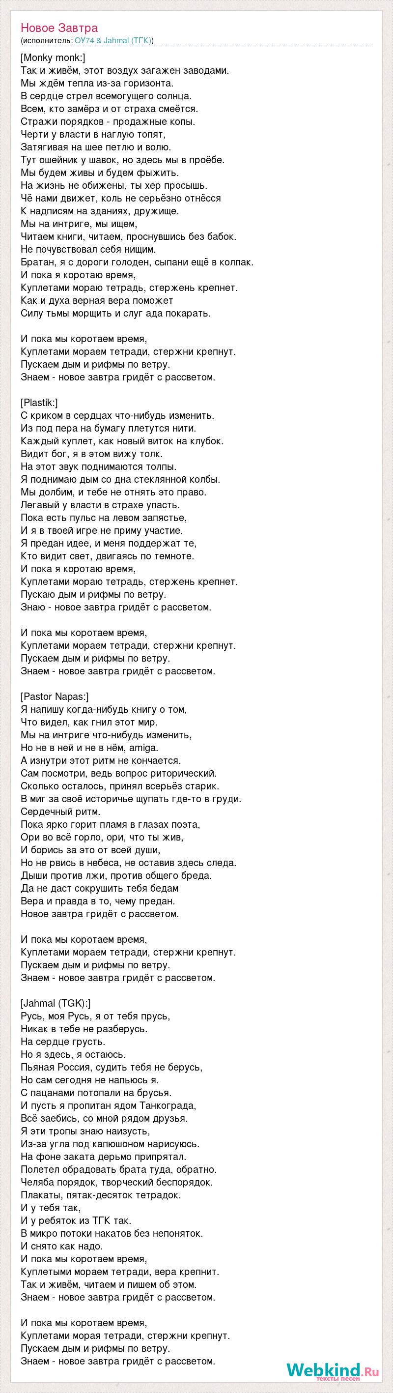 [Monky monk:] Так и живём, этот воздух загажен заводами. Мы ждём тепла из-за горизонта. В сердце стрел всемогущего солнца. Всем, кто замёрз и от страха смеётся. Стражи порядков - продажные копы. Черти у власти в наглую топят, Затягивая на шее петлю и волю. Тут ошейник у шавок, но здесь мы в проёбе. Мы будем живы и будем фыжить. На жизнь не обижены, ты хер просышь. Чё нами движет, коль не серьёзно отнёсся К надписям на зданиях, дружище. Мы на интриге, мы ищем, Читаем книги, читаем, проснувшись без бабок. Не почувствовал себя нищим. Братан, я с дороги голоден, сыпани ещё в колпак. И пока я коротаю время, Куплетами мораю тетрадь, стержень крепнет. Как и духа верная вера поможет Силу тьмы морщить и слуг ада покарать. И пока мы коротаем время, Куплетами мораем тетради, стержни крепнут. Пускаем дым и рифмы по ветру. Знаем - новое завтра гридёт с рассветом. [Plastik:] С криком в сердцах что-нибудь изменить. Из под пера на бумагу плетутся нити. Каждый куплет, как новый виток на клубок. Видит бог, я в этом вижу толк. На этот звук поднимаются толпы. Я поднимаю дым со дна стеклянной колбы. Мы долбим, и тебе не отнять это право. Легавый у власти в страхе упасть. Пока есть пульс на левом запястье, И я в твоей игре не приму участие. Я предан идее, и меня поддержат те, Кто видит свет, двигаясь по темноте. И пока я коротаю время, Куплетами мораю тетрадь, стержень крепнет. Пускаю дым и рифмы по ветру. Знаю - новое завтра гридёт с рассветом. И пока мы коротаем время, Куплетами мораем тетради, стержни крепнут. Пускаем дым и рифмы по ветру. Знаем - новое завтра гридёт с рассветом. [Pastor Napas:] Я напишу когда-нибудь книгу о том, Что видел, как гнил этот мир. Мы на интриге что-нибудь изменить, Но не в ней и не в нём, amiga. А изнутри этот ритм не кончается. Сам посмотри, ведь вопрос риторический. Сколько осталось, принял всерьёз старик. В миг за своё историчье щупать где-то в груди. Сердечный ритм. Пока ярко горит пламя в глазах поэта, Ори во всё горло, ори, что ты жив, И борись за это от всей души, Но не рвись в небеса, не оставив здесь следа. Дыши против лжи, против общего бреда. Да не даст сокрушить тебя бедам Вера и правда в то, чему предан. Новое завтра гридёт с рассветом. И пока мы коротаем время, Куплетами мораем тетради, стержни крепнут. Пускаем дым и рифмы по ветру. Знаем - новое завтра гридёт с рассветом. [Jahmal (TGK):] Русь, моя Русь, я от тебя прусь, Никак в тебе не разберусь. На сердце грусть. Но я здесь, я остаюсь. Пьяная Россия, судить тебя не берусь, Но сам сегодня не напьюсь я. С пацанами потопали на брусья. И пусть я пропитан ядом Танкограда, Всё заебись, со мной рядом друзья. Я эти тропы знаю наизусть, Из-за угла под капюшоном нарисуюсь. На фоне заката дерьмо припрятал. Полетел обрадовать брата туда, обратно. Челяба порядок, творческий беспорядок. Плакаты, пятак-десяток тетрадок. И у тебя так, И у ребяток из ТГК так. В микро потоки накатов без непоняток. И снято как надо. И пока мы коротаем время, Куплетыми мораем тетради, вера крепнит. Так и живём, читаем и пишем об этом. Знаем - новое завтра гридёт с рассветом. И пока мы коротаем время, Куплетами морая тетради, стержни крепнут. Пускаем дым и рифмы по ветру. Знаем - новое завтра гридёт с рассветом.