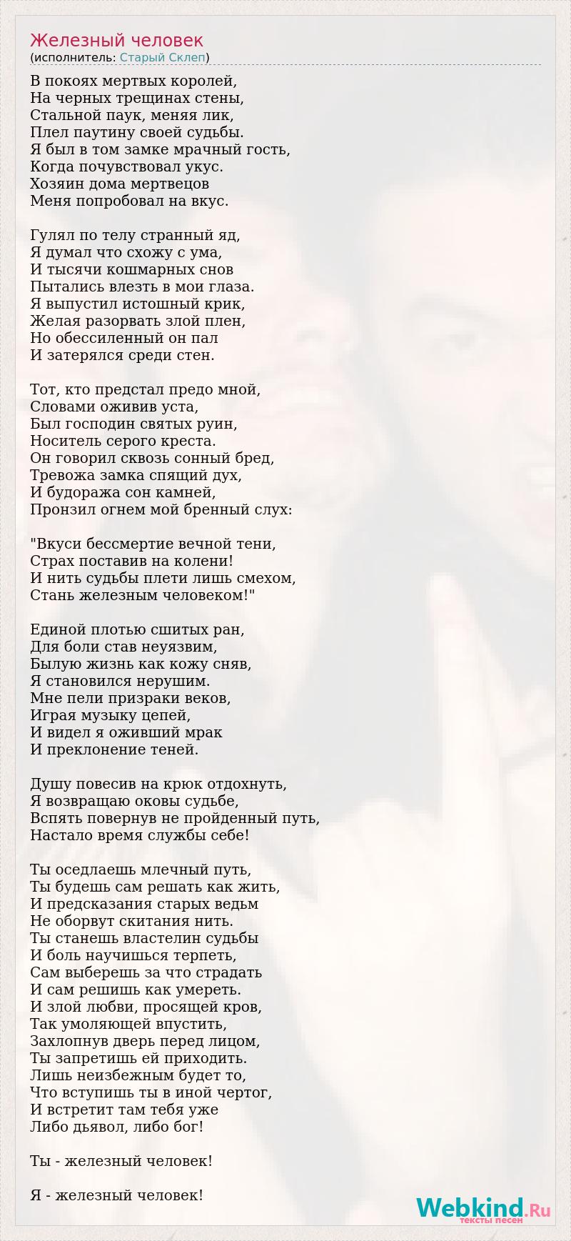 В покоях мертвых королей, На черных трещинах стены, Стальной паук, меняя лик, Плел паутину своей судьбы. Я был в том замке мрачный гость, Когда почувствовал укус. Хозяин дома мертвецов Меня попробовал на вкус. Гулял по телу странный яд, Я думал что схожу с ума, И тысячи кошмарных снов Пытались влезть в мои глаза. Я выпустил истошный крик, Желая разорвать злой плен, Но обессиленный он пал И затерялся среди стен. Тот, кто предстал предо мной, Словами оживив уста, Был господин святых руин, Носитель серого креста. Он говорил сквозь сонный бред, Тревожа замка спящий дух, И будоража сон камней, Пронзил огнем мой бренный слух: "Вкуси бессмертие вечной тени, Страх поставив на колени! И нить судьбы плети лишь смехом, Стань железным человеком!" Единой плотью сшитых ран, Для боли став неуязвим, Былую жизнь как кожу сняв, Я становился нерушим. Мне пели призраки веков, Играя музыку цепей, И видел я оживший мрак И преклонение теней. Душу повесив на крюк отдохнуть, Я возвращаю оковы судьбе, Вспять повернув не пройденный путь, Настало время службы себе! Ты оседлаешь млечный путь, Ты будешь сам решать как жить, И предсказания старых ведьм Не оборвут скитания нить. Ты станешь властелин судьбы И боль научишься терпеть, Сам выберешь за что страдать И сам решишь как умереть. И злой любви, просящей кров, Так умоляющей впустить, Захлопнув дверь перед лицом, Ты запретишь ей приходить. Лишь неизбежным будет то, Что вступишь ты в иной чертог, И встретит там тебя уже Либо дьявол, либо бог! Ты - железный человек! Я - железный человек!
