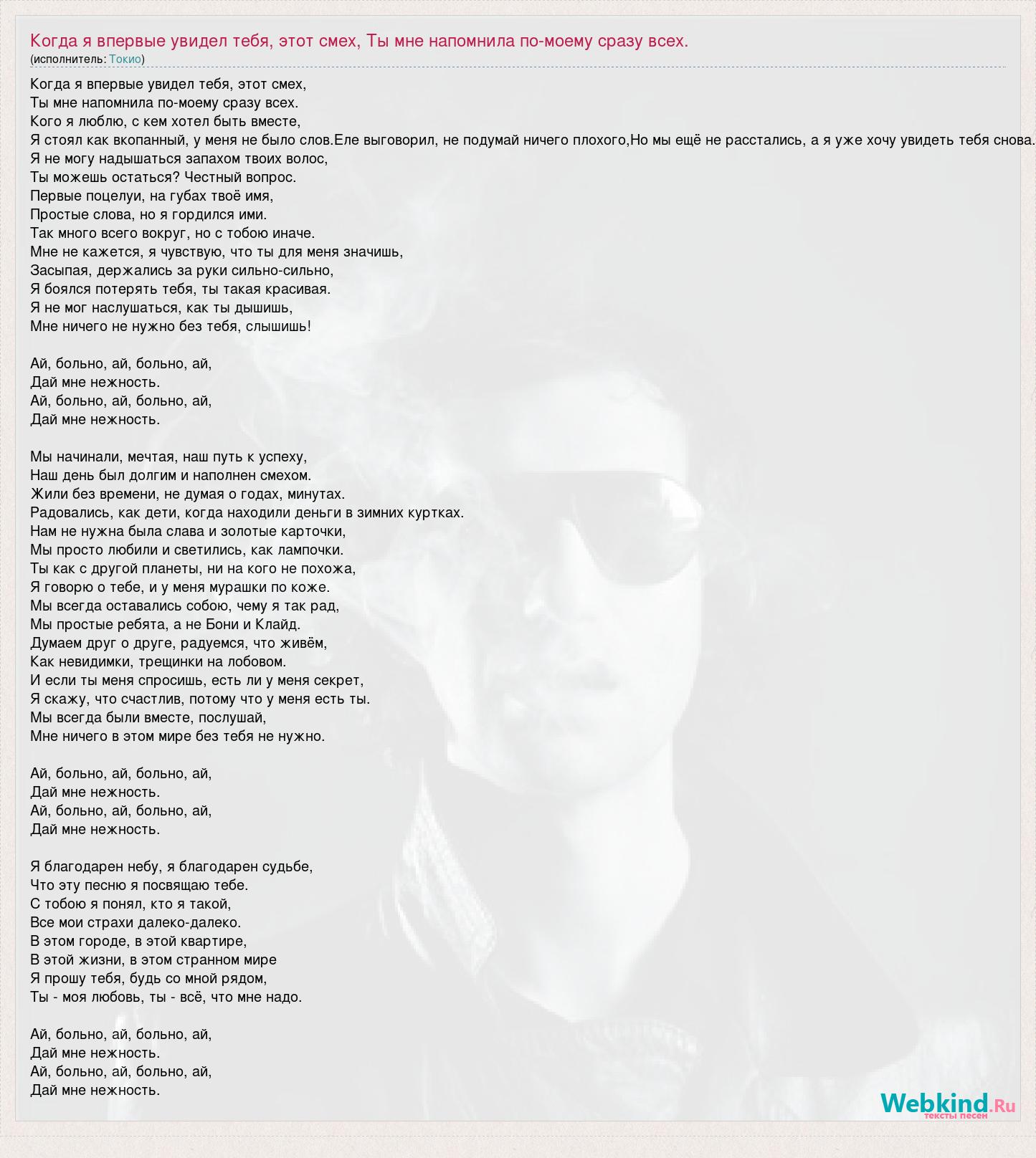 Когда я впервые увидел тебя, этот смех, Ты мне напомнила по-моему сразу всех. Кого я люблю, с кем хотел быть вместе, Я стоял как вкопанный, у меня не было слов.Еле выговорил, не подумай ничего плохого,Но мы ещё не расстались, а я уже хочу увидеть тебя снова. Я не могу надышаться запахом твоих волос, Ты можешь остаться? Честный вопрос. Первые поцелуи, на губах твоё имя, Простые слова, но я гордился ими. Так много всего вокруг, но с тобою иначе. Мне не кажется, я чувствую, что ты для меня значишь, Засыпая, держались за руки сильно-сильно, Я боялся потерять тебя, ты такая красивая. Я не мог наслушаться, как ты дышишь, Мне ничего не нужно без тебя, слышишь! Ай, больно, ай, больно, ай, Дай мне нежность. Ай, больно, ай, больно, ай, Дай мне нежность. Мы начинали, мечтая, наш путь к успеху, Наш день был долгим и наполнен смехом. Жили без времени, не думая о годах, минутах. Радовались, как дети, когда находили деньги в зимних куртках. Нам не нужна была слава и золотые карточки, Мы просто любили и светились, как лампочки. Ты как с другой планеты, ни на кого не похожа, Я говорю о тебе, и у меня мурашки по коже. Мы всегда оставались собою, чему я так рад, Мы простые ребята, а не Бони и Клайд. Думаем друг о друге, радуемся, что живём, Как невидимки, трещинки на лобовом. И если ты меня спросишь, есть ли у меня секрет, Я скажу, что счастлив, потому что у меня есть ты. Мы всегда были вместе, послушай, Мне ничего в этом мире без тебя не нужно. Ай, больно, ай, больно, ай, Дай мне нежность. Ай, больно, ай, больно, ай, Дай мне нежность. Я благодарен небу, я благодарен судьбе, Что эту песню я посвящаю тебе. С тобою я понял, кто я такой, Все мои страхи далеко-далеко. В этом городе, в этой квартире, В этой жизни, в этом странном мире Я прошу тебя, будь со мной рядом, Ты - моя любовь, ты - всё, что мне надо. Ай, больно, ай, больно, ай, Дай мне нежность. Ай, больно, ай, больно, ай, Дай мне нежность.