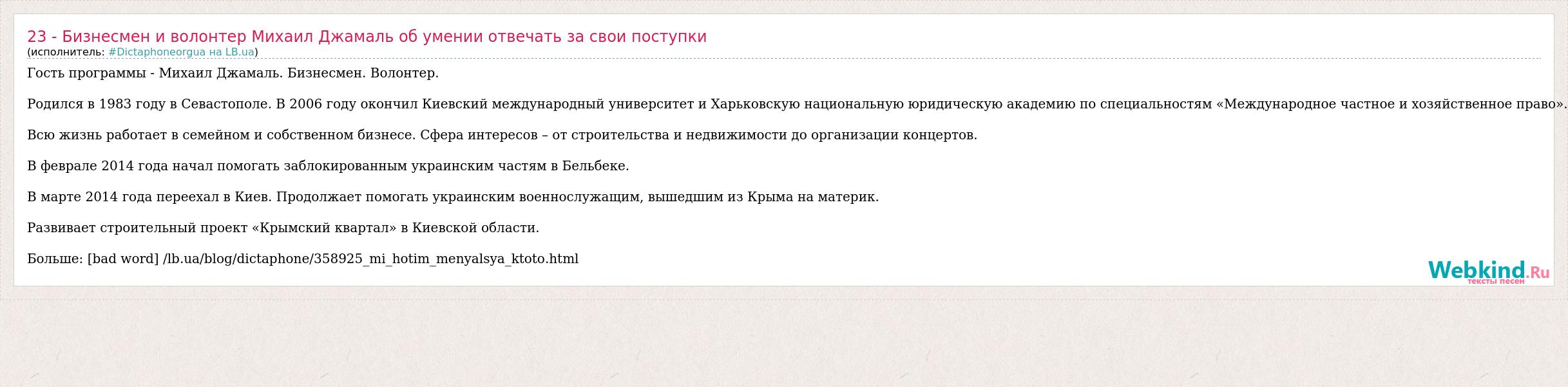 Главная→Исполнители→#Dictaphoneorgua на LB.ua→23 - Бизнесмен и волонтер Михаил Джамаль об умении отвечать за свои пос