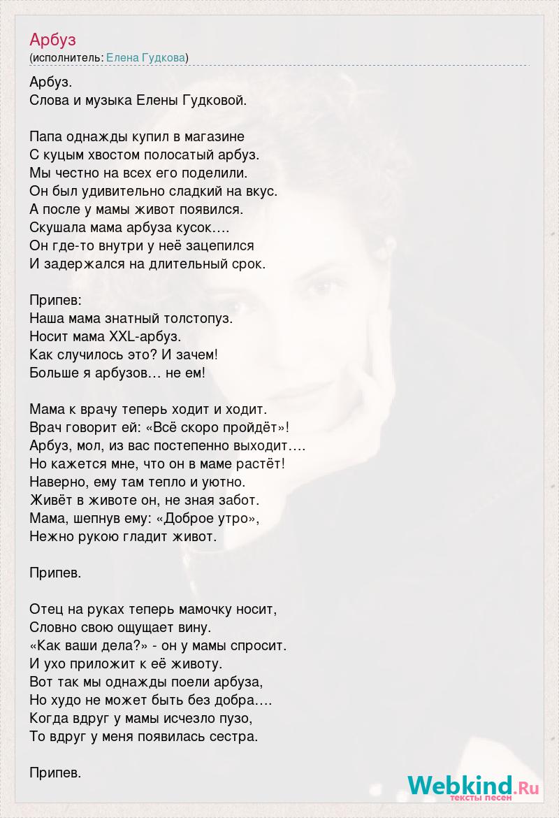 Арбуз. Слова и музыка Елены Гудковой. Папа однажды купил в магазине С куцым хвостом полосатый арбуз. Мы честно на всех его поделили. Он был удивительно сладкий на вкус. А после у мамы живот появился. Скушала мама арбуза кусок…. Он где-то внутри у неё зацепился И задержался на длительный срок. Припев: Наша мама знатный толстопуз. Носит мама ХХL-арбуз. Как случилось это? И зачем! Больше я арбузов… не ем! Мама к врачу теперь ходит и ходит. Врач говорит ей: «Всё скоро пройдёт»! Арбуз, мол, из вас постепенно выходит…. Но кажется мне, что он в маме растёт! Наверно, ему там тепло и уютно. Живёт в животе он, не зная забот. Мама, шепнув ему: «Доброе утро», Нежно рукою гладит живот. Припев. Отец на руках теперь мамочку носит, Словно свою ощущает вину. «Как ваши дела?» - он у мамы спросит. И ухо приложит к её животу. Вот так мы однажды поели арбуза, Но худо не может быть без добра…. Когда вдруг у мамы исчезло пузо, То вдруг у меня появилась сестра. Припев.