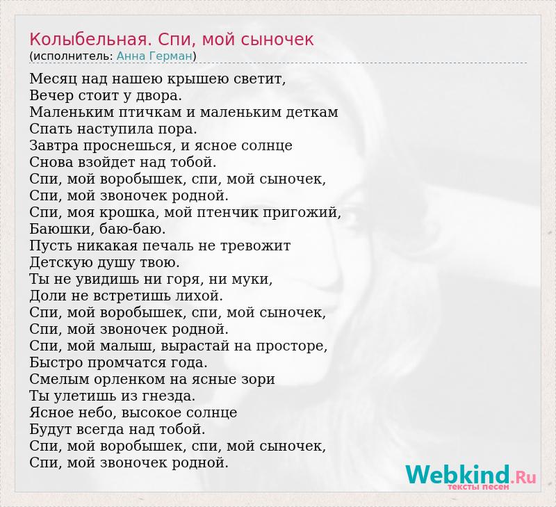 Месяц над нашею крышею светит, Вечер стоит у двора. Маленьким птичкам и маленьким деткам Спать наступила пора. Завтра проснешься, и ясное солнце Снова взойдет над тобой. Спи, мой воробышек, спи, мой сыночек, Спи, мой звоночек родной. Спи, моя крошка, мой птенчик пригожий, Баюшки, баю-баю. Пусть никакая печаль не тревожит Детскую душу твою. Ты не увидишь ни горя, ни муки, Доли не встретишь лихой. Спи, мой воробышек, спи, мой сыночек, Спи, мой звоночек родной. Спи, мой малыш, вырастай на просторе, Быстро промчатся года. Смелым орленком на ясные зори Ты улетишь из гнезда. Ясное небо, высокое солнце Будут всегда над тобой. Спи, мой воробышек, спи, мой сыночек, Спи, мой звоночек родной.