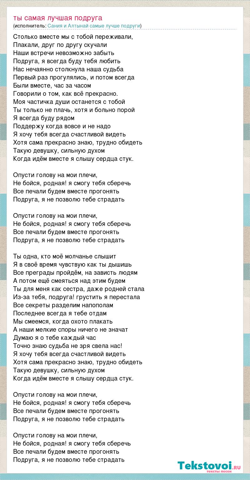 Столько вместе мы с тобой переживали, Плакали, друг по другу скучали Наши встречи невозможно забыть Подруга, я всегда буду тебя любить Нас нечаянно столкнула наша судьба Первый раз прогулялись, и потом всегда Были вместе, час за часом Говорили о том, как всё прекрасно. Моя частичка души останется с тобой Ты только не плачь, хотя и больно порой Я всегда буду рядом Поддержу когда вовсе и не надо Я хочу тебя всегда счастливой видеть Хотя сама прекрасно знаю, трудно обидеть Такую девушку, сильную духом Когда идём вместе я слышу сердца стук. Опусти голову на мои плечи, Не бойся, родная! я смогу тебя сберечь Все печали будем вместе прогонять Подруга, я не позволю тебе страдать Опусти голову на мои плечи, Не бойся, родная! я смогу тебя сберечь Все печали будем вместе прогонять Подруга, я не позволю тебе страдать Ты одна, кто моё молчанье слышит Я в своё время чувствую как ты дышишь Все преграды пройдём, на зависть людям А потом ещё смеяться над этим будем Ты для меня как сестра, даже родней стала Из-за тебя, подруга! грустить я перестала Все секреты разделим напополам Последнее всегда я тебе отдам Мы смеемся, когда охото плакать А наши мелкие споры ничего не значат Думаю я о тебе каждый час Точно знаю судьба не зря свела нас! Я хочу тебя всегда счастливой видеть Хотя сама прекрасно знаю, трудно обидеть Такую девушку, сильную духом Когда идём вместе я слышу сердца стук. Опусти голову на мои плечи, Не бойся, родная! я смогу тебя сберечь Все печали будем вместе прогонять Подруга, я не позволю тебе страдать Опусти голову на мои плечи, Не бойся, родная! я смогу тебя сберечь Все печали будем вместе прогонять Подруга, я не позволю тебе страдать