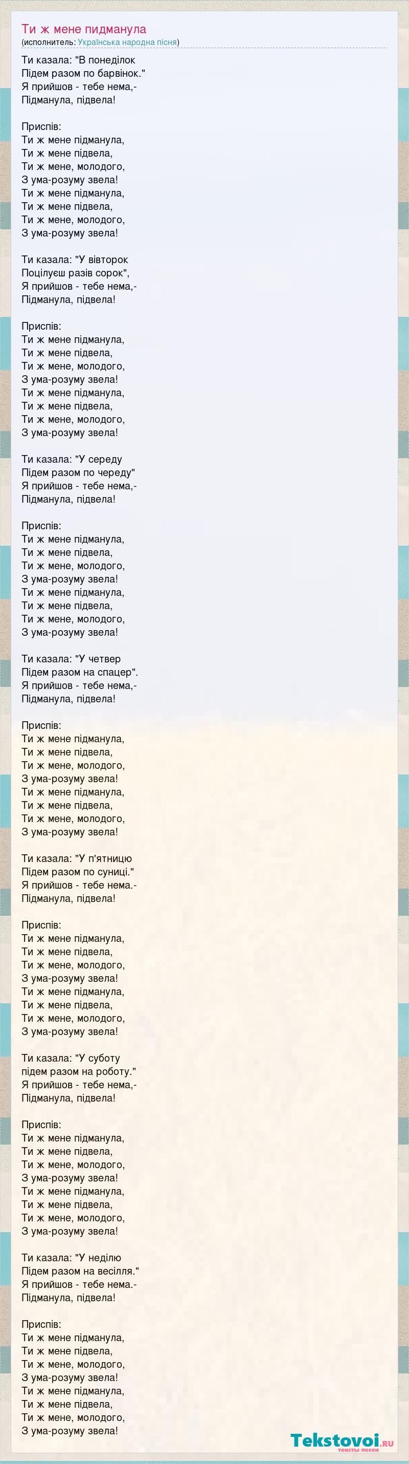 Ти казала: "В понеділок Підем разом по барвінок." Я прийшов - тебе нема,- Підманула, підвела! Приспів: Ти ж мене підманула, Ти ж мене підвела, Ти ж мене, молодого, З ума-розуму звела! Ти ж мене підманула, Ти ж мене підвела, Ти ж мене, молодого, З ума-розуму звела! Ти казала: "У вівторок Поцілуєш разів сорок", Я прийшов - тебе нема,- Підманула, підвела! Приспів: Ти ж мене підманула, Ти ж мене підвела, Ти ж мене, молодого, З ума-розуму звела! Ти ж мене підманула, Ти ж мене підвела, Ти ж мене, молодого, З ума-розуму звела! Ти казала: "У середу Підем разом по череду" Я прийшов - тебе нема,- Підманула, підвела! Приспів: Ти ж мене підманула, Ти ж мене підвела, Ти ж мене, молодого, З ума-розуму звела! Ти ж мене підманула, Ти ж мене підвела, Ти ж мене, молодого, З ума-розуму звела! Ти казала: "У четвер Підем разом на спацер". Я прийшов - тебе нема,- Підманула, підвела! Приспів: Ти ж мене підманула, Ти ж мене підвела, Ти ж мене, молодого, З ума-розуму звела! Ти ж мене підманула, Ти ж мене підвела, Ти ж мене, молодого, З ума-розуму звела! Ти казала: "У п'ятницю Підем разом по суниці." Я прийшов - тебе нема.- Підманула, підвела! Приспів: Ти ж мене підманула, Ти ж мене підвела, Ти ж мене, молодого, З ума-розуму звела! Ти ж мене підманула, Ти ж мене підвела, Ти ж мене, молодого, З ума-розуму звела! Ти казала: "У суботу підем разом на роботу." Я прийшов - тебе нема,- Підманула, підвела! Приспів: Ти ж мене підманула, Ти ж мене підвела, Ти ж мене, молодого, З ума-розуму звела! Ти ж мене підманула, Ти ж мене підвела, Ти ж мене, молодого, З ума-розуму звела! Ти казала: "У неділю Підем разом на весілля." Я прийшов - тебе нема.- Підманула, підвела! Приспів: Ти ж мене підманула, Ти ж мене підвела, Ти ж мене, молодого, З ума-розуму звела! Ти ж мене підманула, Ти ж мене підвела, Ти ж мене, молодого, З ума-розуму звела!