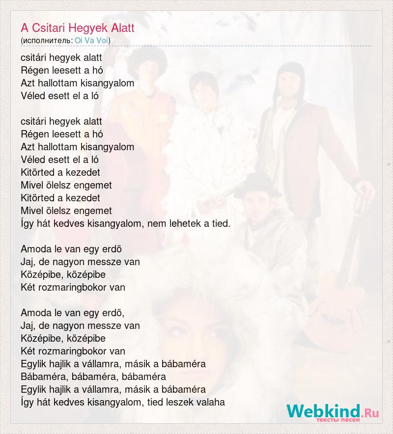 csitári hegyek alatt Régen leesett a hó Azt hallottam kisangyalom Véled esett el a ló csitári hegyek alatt Régen leesett a hó Azt hallottam kisangyalom Véled esett el a ló Kitörted a kezedet Mivel ölelsz engemet Kitörted a kezedet Mivel ölelsz engemet Így hát kedves kisangyalom, nem lehetek a tied. Amoda le van egy erdö Jaj, de nagyon messze van Középibe, középibe Két rozmaringbokor van Amoda le van egy erdö, Jaj, de nagyon messze van Középibe, középibe Két rozmaringbokor van Egylik hajlik a vállamra, másik a bábaméra Bábaméra, bábaméra, bábaméra Egylik hajlik a vállamra, másik a bábaméra Így hát kedves kisangyalom, tied leszek valaha
