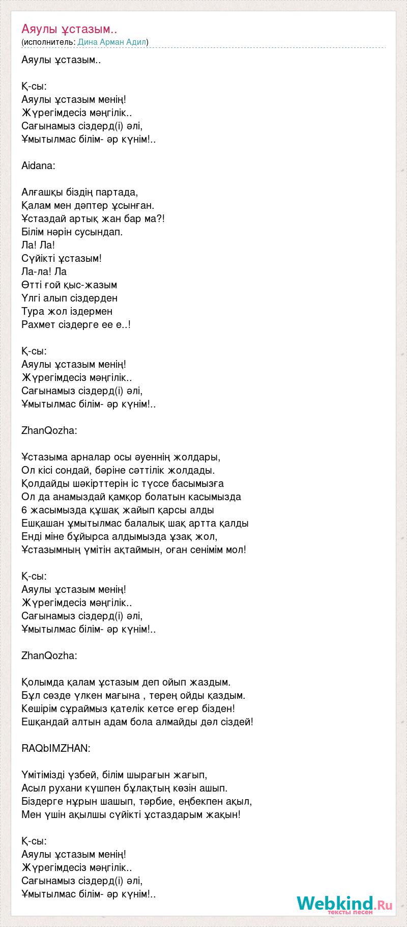 Аяулы ұстазым.. Қ-сы: Аяулы ұстазым менің! Жүрегімдесіз мәңгілік.. Сағынамыз сіздерд(і) әлі, Ұмытылмас білім- әр күнім!.. Aidana: Алғашқы біздің партада, Қалам мен дәптер ұсынған. Ұстаздай артық жан бар ма?! Білім нәрін сусындап. Ла! Ла! Сүйікті ұстазым! Ла-ла! Ла Өтті ғой қыс-жазым Үлгі алып сіздерден Тура жол іздермен Рахмет сіздерге ее е..! Қ-сы: Аяулы ұстазым менің! Жүрегімдесіз мәңгілік.. Сағынамыз сіздерд(і) әлі, Ұмытылмас білім- әр күнім!.. ZhanQozha: Ұстазыма арналар осы әуеннің жолдары, Ол кісі сондай, бәріне сәттілік жолдады. Қолдайды шәкірттерін іс түссе басымызға Ол да анамыздай қамқор болатын касымызда 6 жасымызда құшақ жайып қарсы алды Ешқашан ұмытылмас балалық шақ артта қалды Енді міне бұйырса алдымызда ұзақ жол, Ұстазымның үмітін ақтаймын, оған сенімім мол! Қ-сы: Аяулы ұстазым менің! Жүрегімдесіз мәңгілік.. Сағынамыз сіздерд(і) әлі, Ұмытылмас білім- әр күнім!.. ZhanQozha: Қолымда қалам ұстазым деп ойып жаздым. Бұл сөзде үлкен мағына , терең ойды қаздым. Кешірім сұраймыз қателік кетсе егер бізден! Ешқандай алтын адам бола алмайды дәл сіздей! RAQbIMZHAN: Үмітімізді үзбей, білім шырағын жағып, Асыл рухани күшпен бұлақтың көзін ашып. Біздерге нұрын шашып, тәрбие, еңбекпен ақыл, Мен үшін ақылшы сүйікті ұстаздарым жақын! Қ-сы: Аяулы ұстазым менің! Жүрегімдесіз мәңгілік.. Сағынамыз сіздерд(і) әлі, Ұмытылмас білім- әр күнім!..