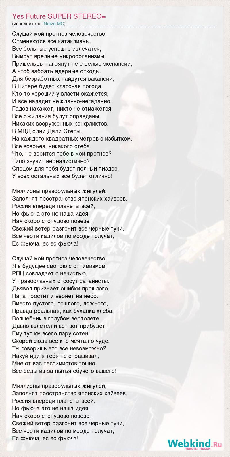 Слушай мой прогноз человечество, Отменяются все катаклизмы. Все больные успешно излечатся, Вымрут вредные микроорганизмы. Пришельцы нагрянут не с целью экспансии, А чтоб забрать ядерные отходы. Для безработных найдутся вакансии, В Питере будет классная погода. Кто-то хороший у власти окажется, И всё наладит нежданно-негаданно. Гадов накажет, никто не отмажется, Все ожидания будут оправданы. Никаких вооруженных конфликтов, В МВД одни Дяди Степы. На каждого квадратных метров с избытком, Все всерьез, никакого стеба. Что, не верится тебе в мой прогноз? Типо звучит нереалистично? Спецом для тебя будет полный пиздос, У всех остальных все будет отлично! Миллионы праворульных жигулей, Заполнят пространство японских хайвеев. Россия впереди планеты всей, Но фьюча это не наша идея. Нам скоро стопудово повезет, Свежий ветер разгонит все черные тучи. Все черти кадилом по морде получат, Ес фьюча, ес ес фьюча! Слушай мой прогноз человечество, Я в будущее смотрю с оптимизмом. РПЦ совладает с нечистью, У православных отсосут сатанисты. Дьявол признает ошибки прошлого, Папа простит и вернет на небо. Вместо пустого, пошлого, ложного, Правда реальная, как буханка хлеба. Волшебник в голубом вертолете Давно взлетел и вот вот прибудет, Ему тут км всего пару сотен, Скорей сюда все кто мечтал о чуде. Ты говоришь это все невозможно? Нахуй иди я тебя не спрашивал, Мне от вас пессимистов тошно, Все беды из-за нытья ебучего вашего! Миллионы праворульных жигулей, Заполнят пространство японских хайвеев. Россия впереди планеты всей, Но фьюча это не наша идея. Нам скоро стопудово повезет, Свежий ветер разгонит все черные тучи, Все черти кадилом по морде получат, Ес фьюча, ес ес фьюча!