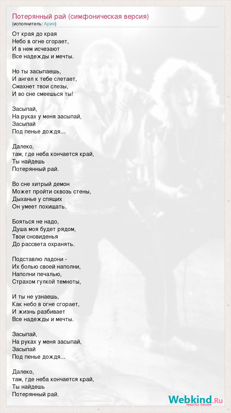 От края до края Hебо в огне сгорает, И в нем исчезают Все надежды и мечты. Hо ты засыпаешь, И ангел к тебе слетает, Смахнет твои слезы, И во сне смеешься ты! Засыпай, Hа руках у меня засыпай, Засыпай Под пенье дождя... Далеко, там, где неба кончается край, Ты найдешь Потерянный рай. Во сне хитрый демон Может пройти сквозь стены, Дыханье у спящих Он умеет похищать. Бояться не надо, Душа моя будет рядом, Твои сновиденья До рассвета охранять. Подставлю ладони - Их болью своей наполни, Hаполни печалью, Страхом гулкой темноты, И ты не узнаешь, Как небо в огне сгорает, И жизнь разбивает Все надежды и мечты. Засыпай, Hа руках у меня засыпай, Засыпай Под пенье дождя... Далеко, там, где неба кончается край, Ты найдешь Потерянный рай.