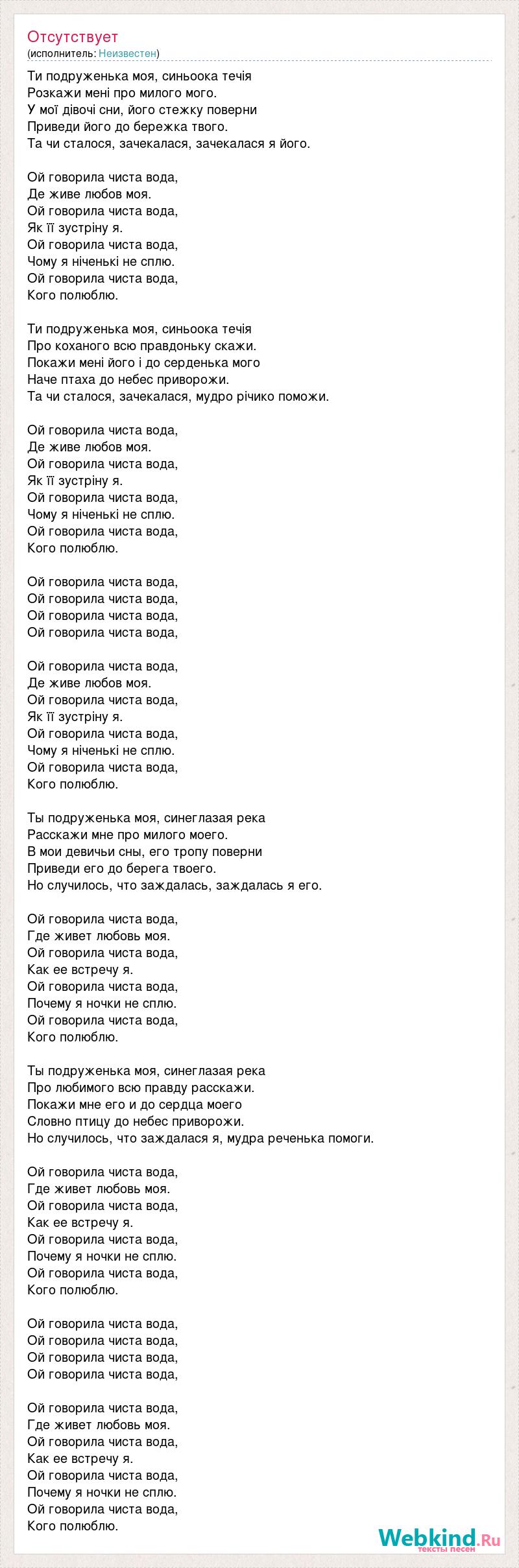 Ти подруженька моя, синьоока течія Розкажи мені про милого мого. У мої дівочі сни, його стежку поверни Приведи його до бережка твого. Та чи сталося, зачекалася, зачекалася я його. Ой говорила чиста вода, Де живе любов моя. Ой говорила чиста вода, Як її зустріну я. Ой говорила чиста вода, Чому я ніченькі не сплю. Ой говорила чиста вода, Кого полюблю. Ти подруженька моя, синьоока течія Про коханого всю правдоньку скажи. Покажи мені його і до серденька мого Наче птаха до небес приворожи. Та чи сталося, зачекалася, мудро річико поможи. Ой говорила чиста вода, Де живе любов моя. Ой говорила чиста вода, Як її зустріну я. Ой говорила чиста вода, Чому я ніченькі не сплю. Ой говорила чиста вода, Кого полюблю. Ой говорила чиста вода, Ой говорила чиста вода, Ой говорила чиста вода, Ой говорила чиста вода, Ой говорила чиста вода, Де живе любов моя. Ой говорила чиста вода, Як її зустріну я. Ой говорила чиста вода, Чому я ніченькі не сплю. Ой говорила чиста вода, Кого полюблю. Ты подруженька моя, синеглазая река Расскажи мне про милого моего. В мои девичьи сны, его тропу поверни Приведи его до берега твоего. Но случилось, что заждалась, заждалась я его. Ой говорила чиста вода, Где живет любовь моя. Ой говорила чиста вода, Как ее встречу я. Ой говорила чиста вода, Почему я ночки не сплю. Ой говорила чиста вода, Кого полюблю. Ты подруженька моя, синеглазая река Про любимого всю правду расскажи. Покажи мне его и до сердца моего Словно птицу до небес приворожи. Но случилось, что заждалася я, мудра реченька помоги. Ой говорила чиста вода, Где живет любовь моя. Ой говорила чиста вода, Как ее встречу я. Ой говорила чиста вода, Почему я ночки не сплю. Ой говорила чиста вода, Кого полюблю. Ой говорила чиста вода, Ой говорила чиста вода, Ой говорила чиста вода, Ой говорила чиста вода, Ой говорила чиста вода, Где живет любовь моя. Ой говорила чиста вода, Как ее встречу я. Ой говорила чиста вода, Почему я ночки не сплю. Ой говорила чиста вода, Кого полюблю.