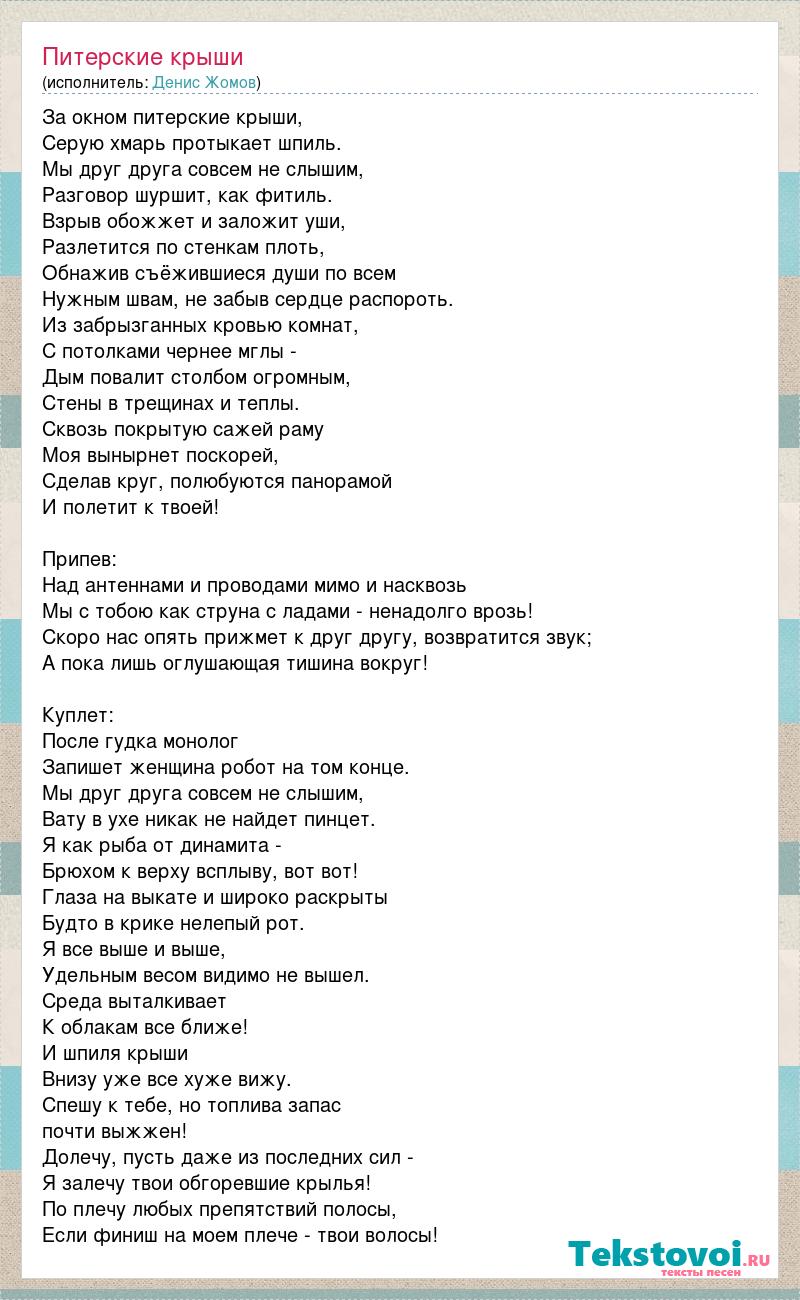 За окном питерские крыши, Серую хмарь протыкает шпиль. Мы друг друга совсем не слышим, Разговор шуршит, как фитиль. Взрыв обожжет и заложит уши, Разлетится по стенкам плоть, Обнажив съёжившиеся души по всем Нужным швам, не забыв сердце распороть. Из забрызганных кровью комнат, С потолками чернее мглы - Дым повалит столбом огромным, Стены в трещинах и теплы. Сквозь покрытую сажей раму Моя вынырнет поскорей, Сделав круг, полюбуются панорамой И полетит к твоей! Припев: Над антеннами и проводами мимо и насквозь Мы с тобою как струна с ладами - ненадолго врозь! Скоро нас опять прижмет к друг другу, возвратится звук; А пока лишь оглушающая тишина вокруг! Куплет: После гудка монолог Запишет женщина робот на том конце. Мы друг друга совсем не слышим, Вату в ухе никак не найдет пинцет. Я как рыба от динамита - Брюхом к верху всплыву, вот вот! Глаза на выкате и широко раскрыты Будто в крике нелепый рот. Я все выше и выше, Удельным весом видимо не вышел. Среда выталкивает К облакам все ближе! И шпиля крыши Внизу уже все хуже вижу. Спешу к тебе, но топлива запас почти выжжен! Долечу, пусть даже из последних сил - Я залечу твои обгоревшие крылья! По плечу любых препятствий полосы, Если финиш на моем плече - твои волосы!
