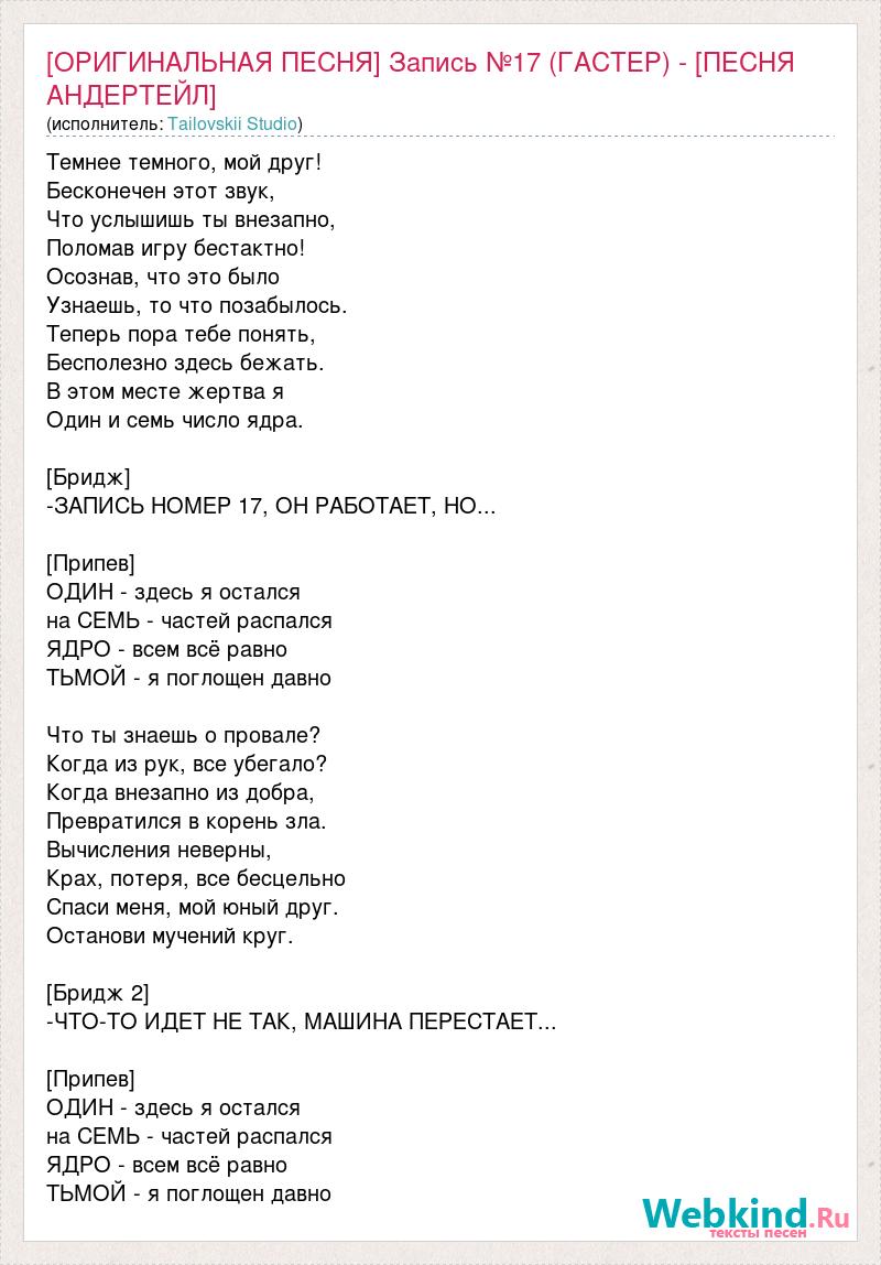 Темнее темного, мой друг! Бесконечен этот звук, Что услышишь ты внезапно, Поломав игру бестактно! Осознав, что это было Узнаешь, то что позабылось. Теперь пора тебе понять, Бесполезно здесь бежать. В этом месте жертва я Один и семь число ядра. [Бридж] -ЗАПИСЬ НОМЕР 17, ОН РАБОТАЕТ, НО... [Припев] ОДИН - здесь я остался на СЕМЬ - частей распался ЯДРО - всем всё равно ТЬМОЙ - я поглощен давно Что ты знаешь о провале? Когда из рук, все убегало? Когда внезапно из добра, Превратился в корень зла. Вычисления неверны, Крах, потеря, все бесцельно Спаси меня, мой юный друг. Останови мучений круг. [Бридж 2] -ЧТО-ТО ИДЕТ НЕ ТАК, МАШИНА ПЕРЕСТАЕТ... [Припев] ОДИН - здесь я остался на СЕМЬ - частей распался ЯДРО - всем всё равно ТЬМОЙ - я поглощен давно